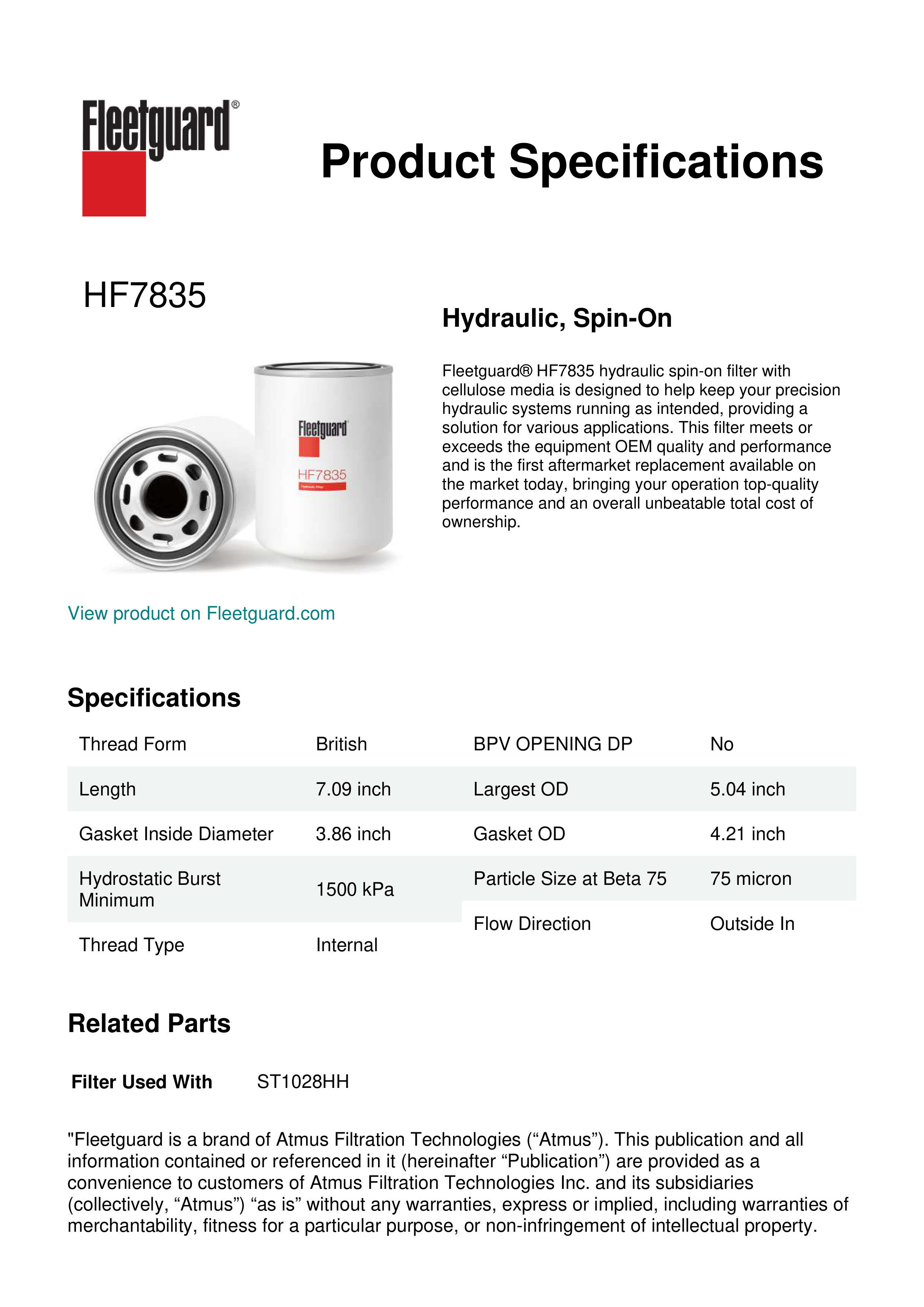 Fleetguard® HF7835 hydraulic spin-on filter with cellulose media is designed to help keep your precision hydraulic systems running as intended, providing a solution for various applications. This filter meets or exceeds the equipment OEM quality and performance and is the first aftermarket replacement available on the market today, bringing your operation top-quality performance and an overall unbeatable total cost of ownership.Specification