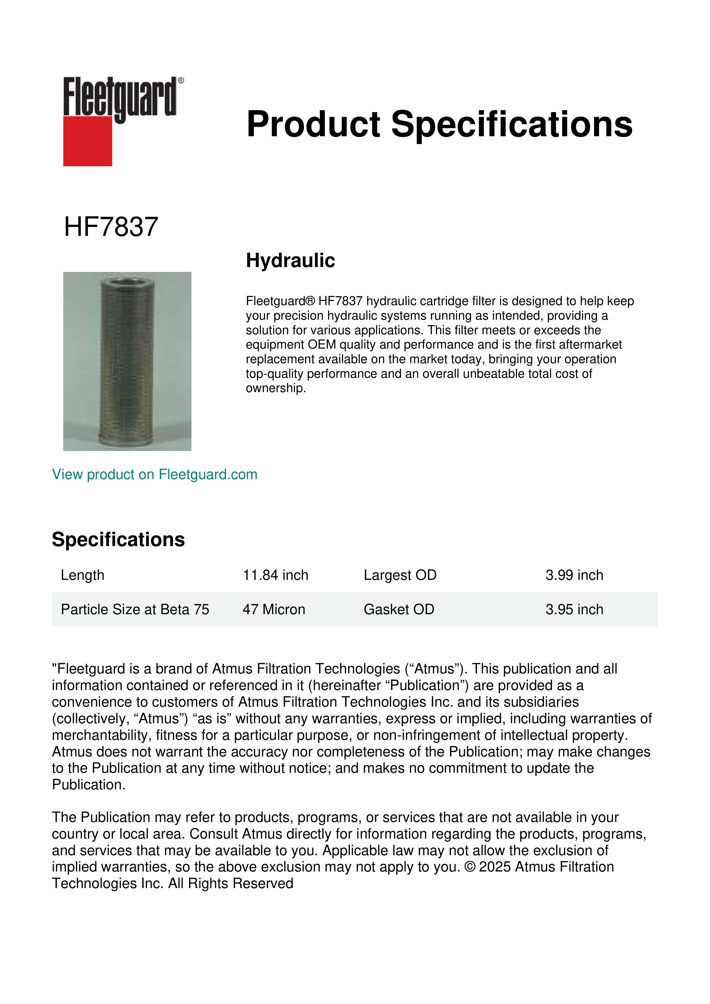 Fleetguard® HF7837 hydraulic cartridge filter is designed to help keep your precision hydraulic systems running as intended, providing a solution for various applications. This filter meets or exceeds the equipment OEM quality and performance and is the first aftermarket replacement available on the market today, bringing your operation top-quality performance and an overall unbeatable total cost of ownership.Specification