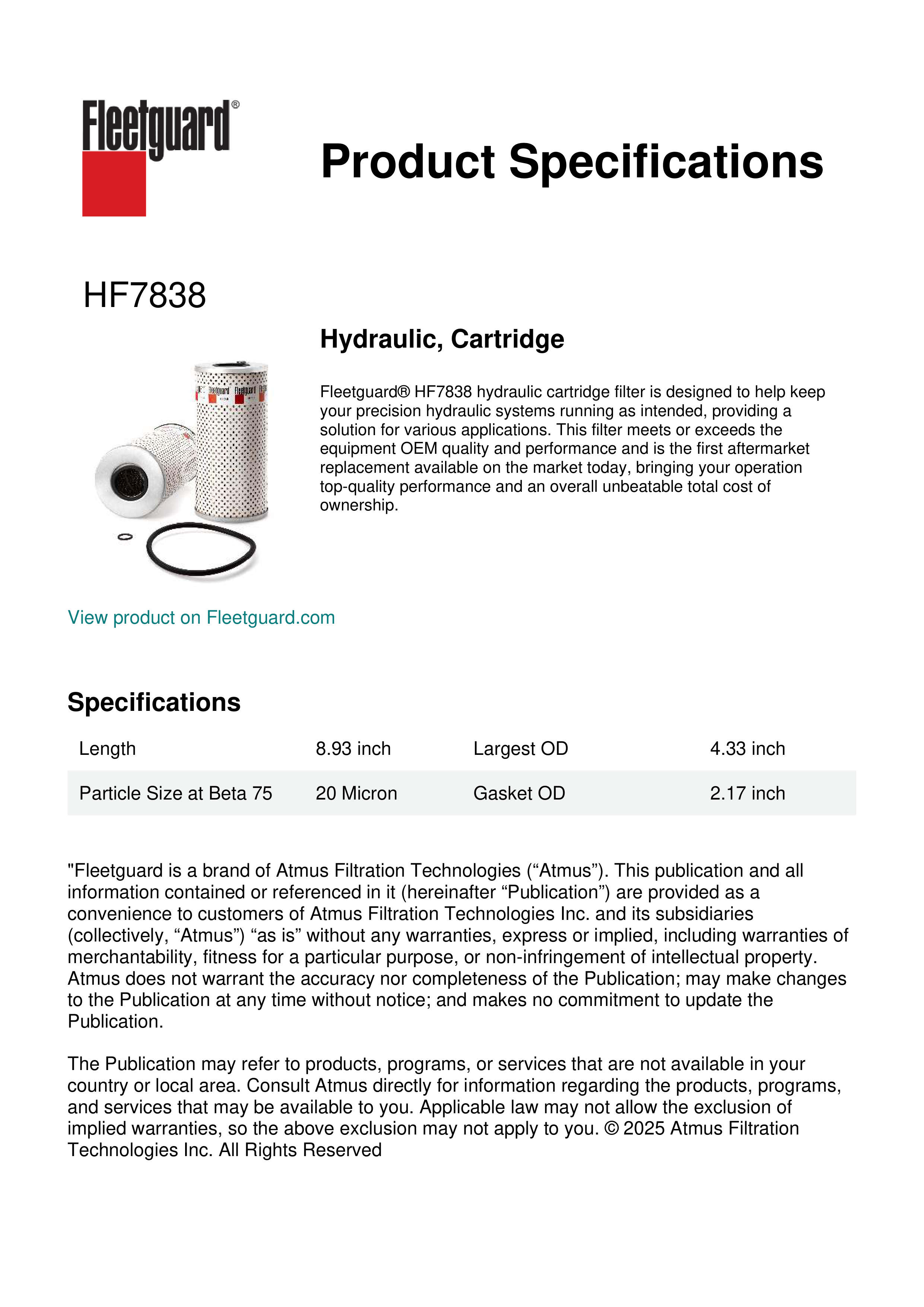 Fleetguard® HF7838 hydraulic cartridge filter is designed to help keep your precision hydraulic systems running as intended, providing a solution for various applications. This filter meets or exceeds the equipment OEM quality and performance and is the first aftermarket replacement available on the market today, bringing your operation top-quality performance and an overall unbeatable total cost of ownership.Specification