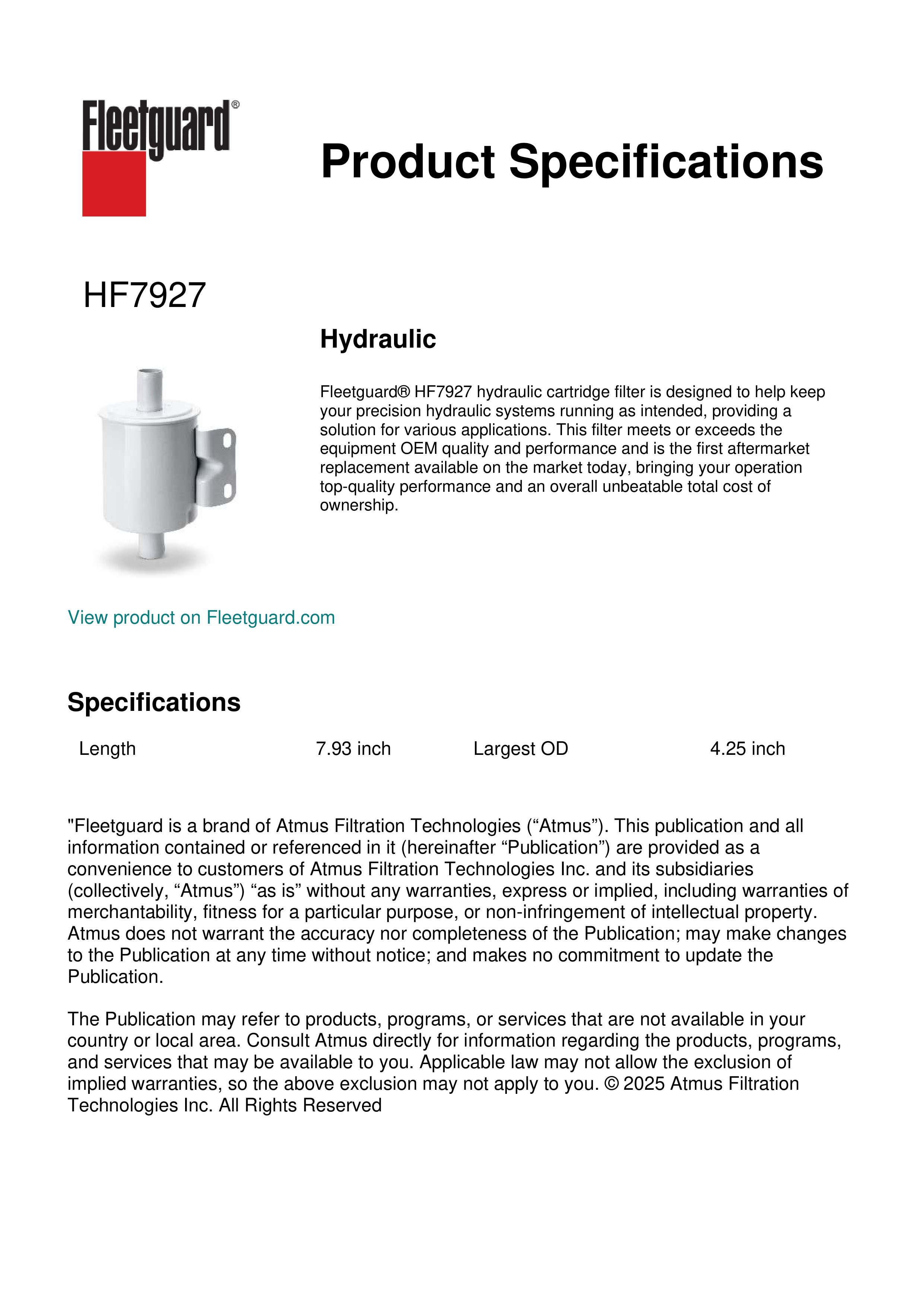 Fleetguard® HF7927 hydraulic cartridge filter is designed to help keep your precision hydraulic systems running as intended, providing a solution for various applications. This filter meets or exceeds the equipment OEM quality and performance and is the first aftermarket replacement available on the market today, bringing your operation top-quality performance and an overall unbeatable total cost of ownership.Specification