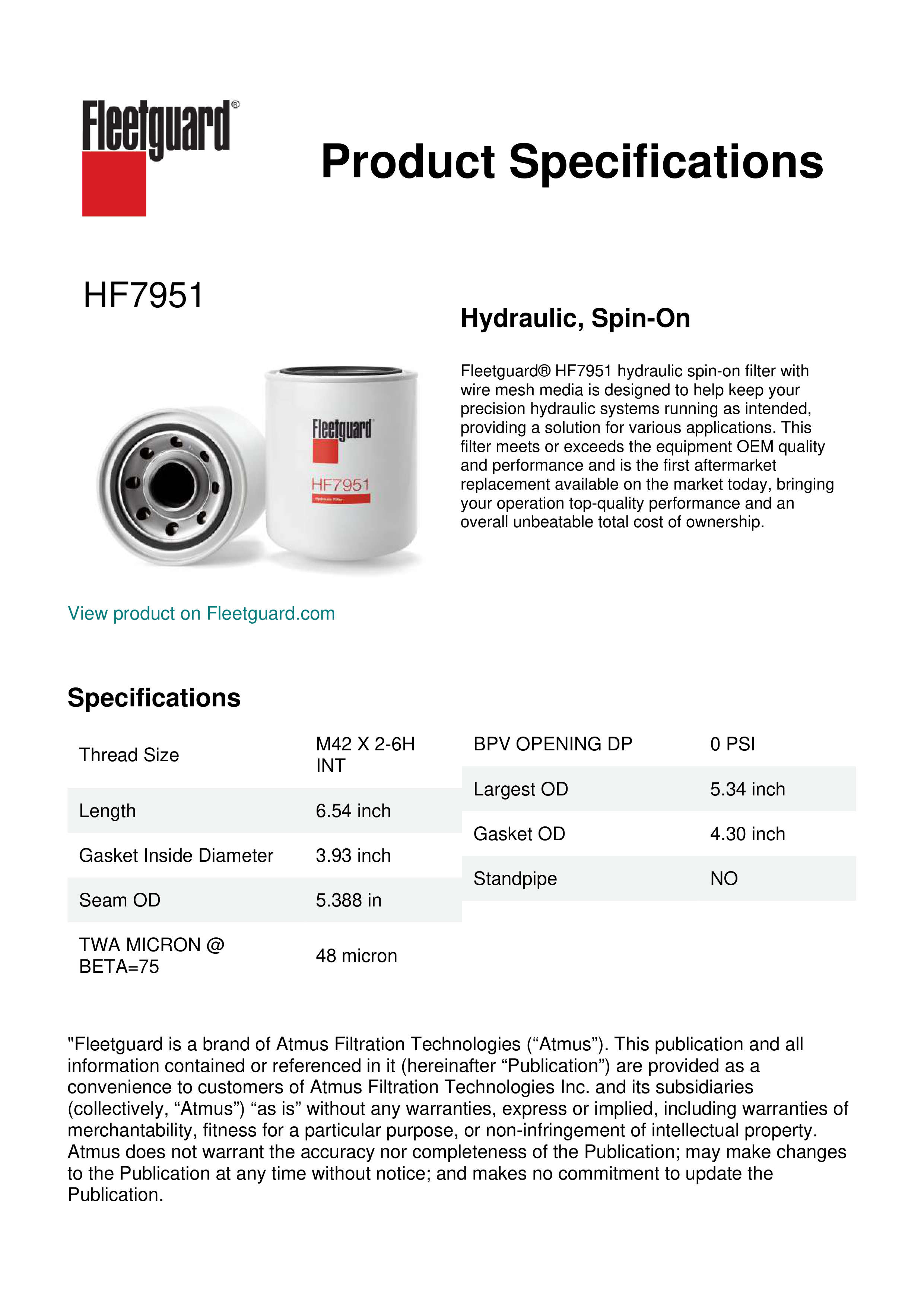 Fleetguard® HF7951 hydraulic spin-on filter with wire mesh media is designed to help keep your precision hydraulic systems running as intended, providing a solution for various applications. This filter meets or exceeds the equipment OEM quality and performance and is the first aftermarket replacement available on the market today, bringing your operation top-quality performance and an overall unbeatable total cost of ownership.Specification