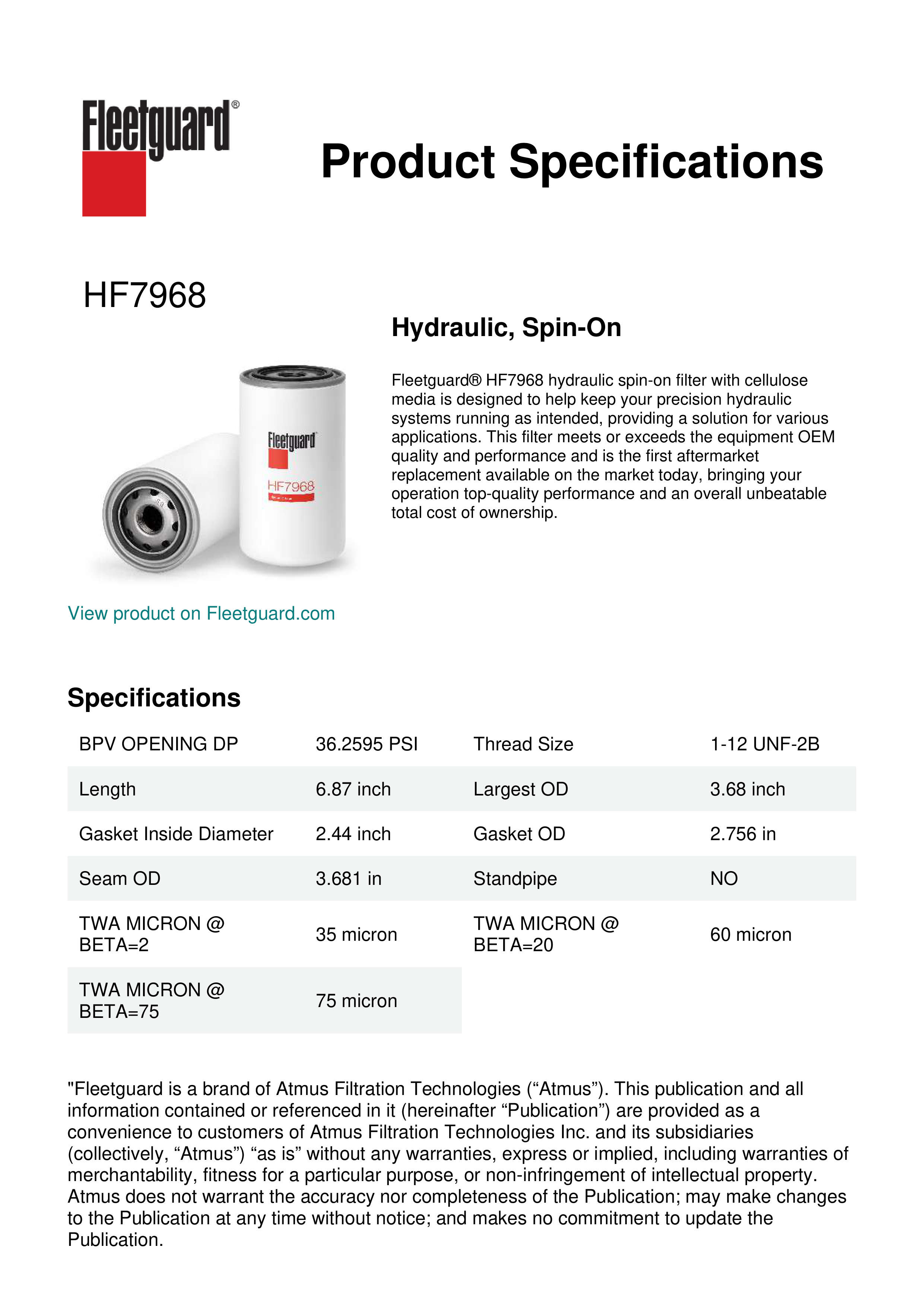 Fleetguard® HF7968 hydraulic spin-on filter with cellulose media is designed to help keep your precision hydraulic systems running as intended, providing a solution for various applications. This filter meets or exceeds the equipment OEM quality and performance and is the first aftermarket replacement available on the market today, bringing your operation top-quality performance and an overall unbeatable total cost of ownership.Specification