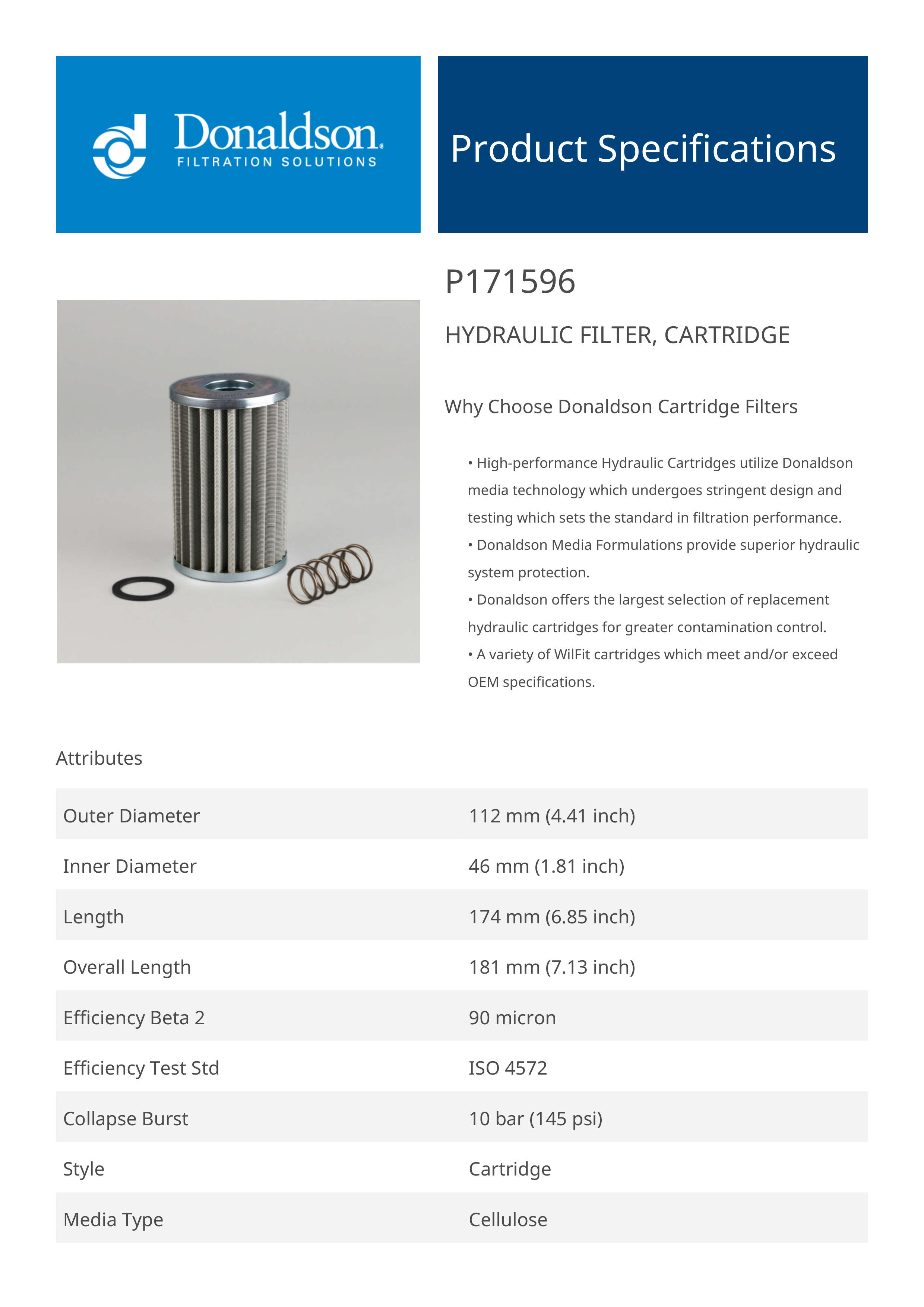 Genuine Donaldson P171596 Hydraulic Filter, Cartridge is designed to provide superior protection for your hydraulic system, effectively capturing contaminants to ensure clean fluid circulation. With high-quality filtration media, it extends equipment life, improves operational efficiency, and maintains fluid cleanliness even in the most demanding environments.Built for industrial, agricultural, and heavy-duty applications, this filter offers excellent dirt-holding capacity and flow efficiency. Its easy installation and maintenance help reduce downtime, making it a reliable choice for keeping hydraulic systems running smoothly.