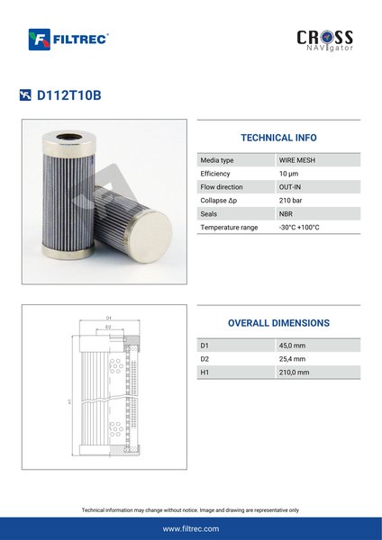 Genuine Filtrec D112T10B. This Filtrec element is designed to meet or exceed the quality and performance of brand OEM’s ensuring superior filtration performance and long-lasting durability.