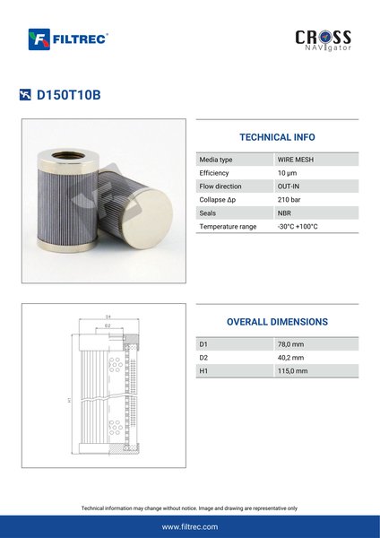 Engineered with their high performance media and a durable design, the D150T10B provides reliable and consistent performance over its lifespan, even in harsh operating environments. When you order from FilterFinder, you can trust that you are getting a reliable and high-quality replacement filter that will keep your system running smoothly.