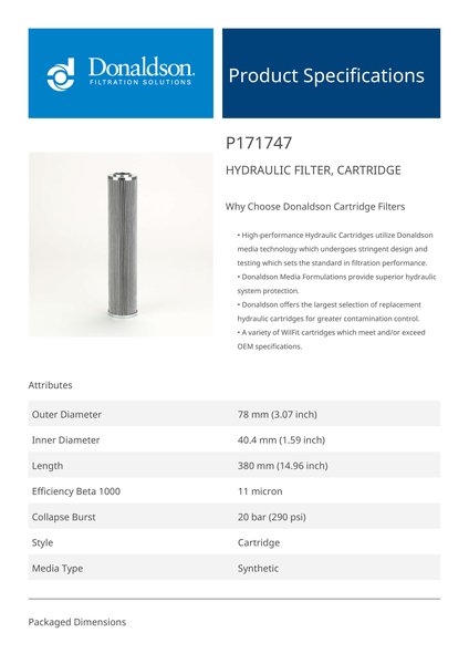 Genuine Donaldson P171747 Hydraulic Filter, Cartridge is designed to provide superior protection for your hydraulic system, effectively capturing contaminants to ensure clean fluid circulation. With high-quality filtration media, it extends equipment life, improves operational efficiency, and maintains fluid cleanliness even in the most demanding environments.