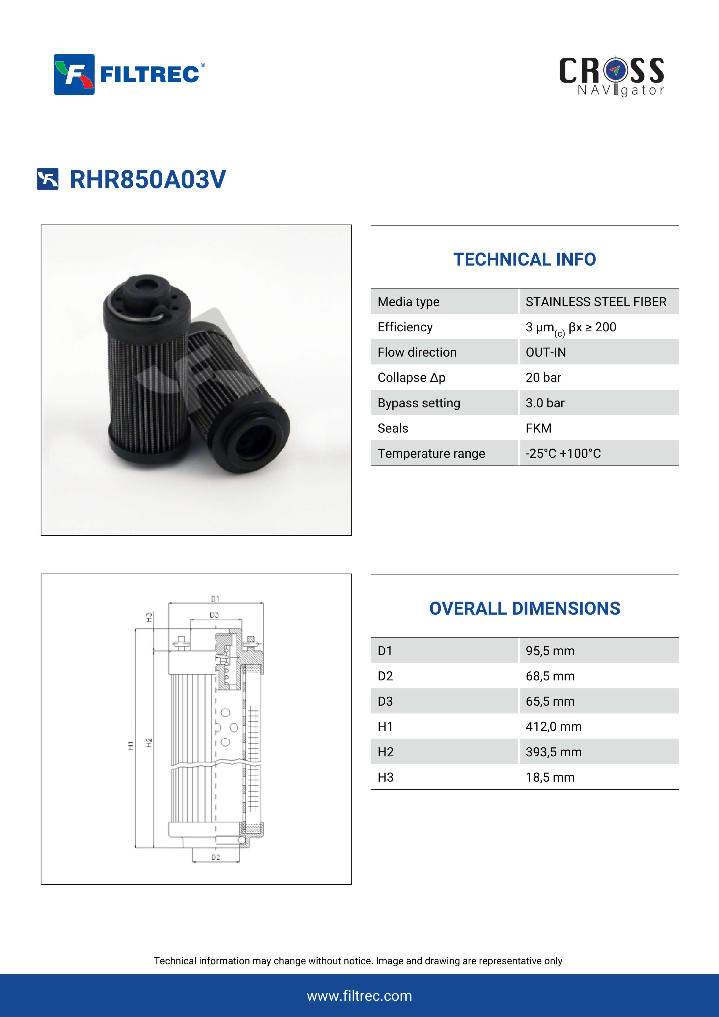 Genuine Filtrec RHR850A03V. This Filtrec element is designed to meet or exceed the quality and performance of brand OEM’s ensuring superior filtration performance and long-lasting durability.