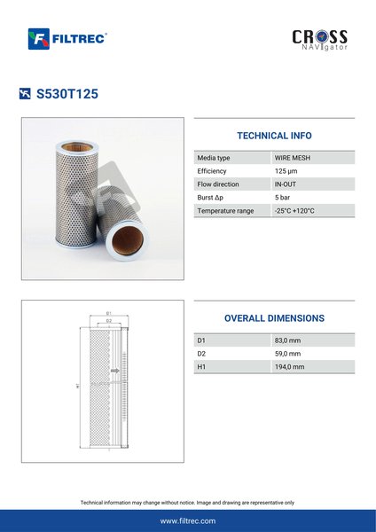 Genuine Filtrec S530T125. This Filtrec element is designed to meet or exceed the quality and performance of brand OEM’s ensuring superior filtration performance and long-lasting durability.