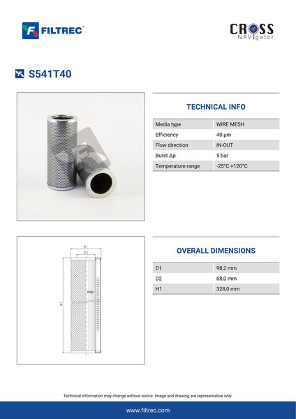 Genuine Filtrec S541T40. This Filtrec element is designed to meet or exceed the quality and performance of brand OEM’s ensuring superior filtration performance and long-lasting durability.