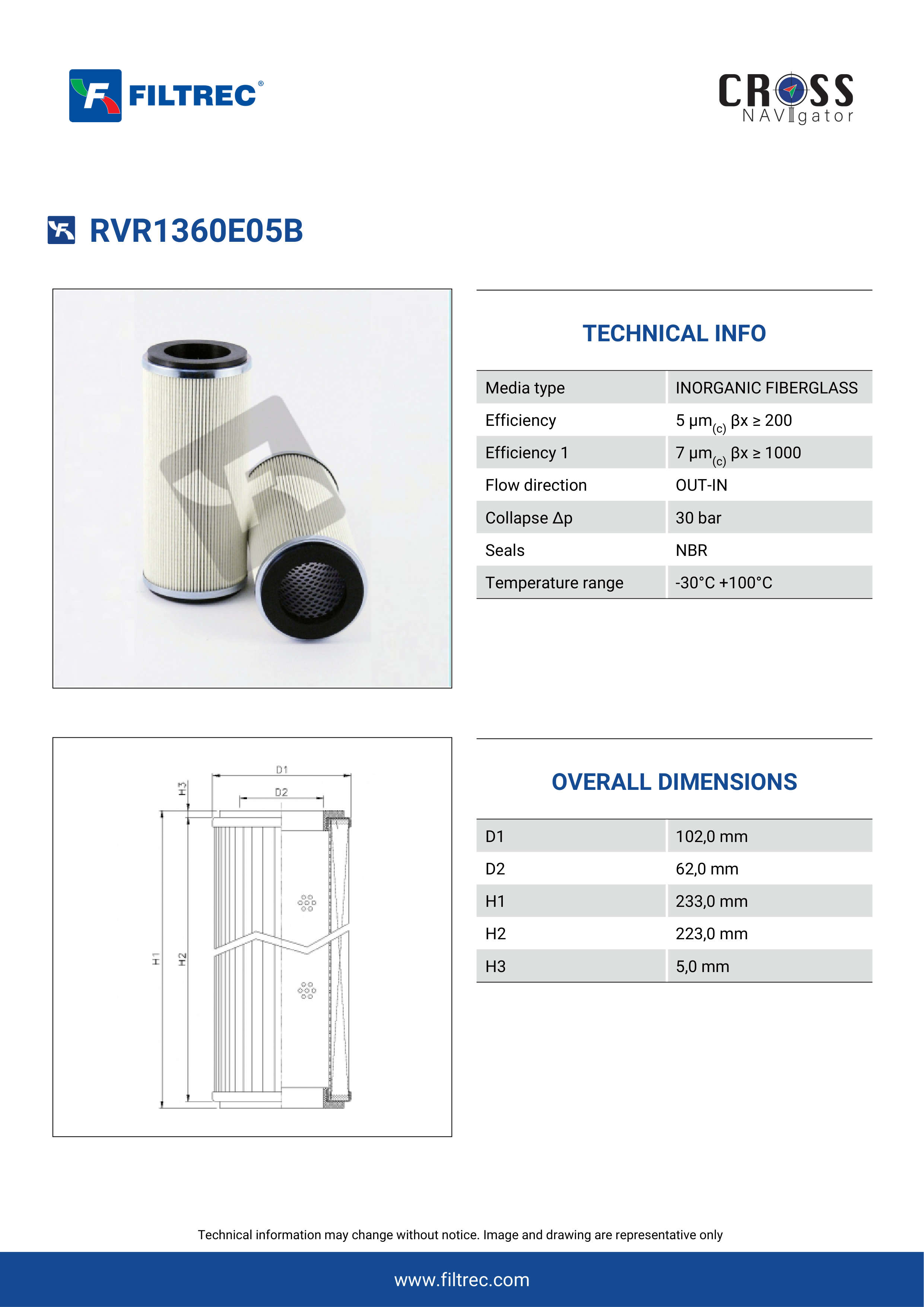 Genuine Filtrec RVR1360E05B. This Filtrec element is designed to meet or exceed the quality and performance of brand OEM’s ensuring superior filtration performance and long-lasting durability.Engineered with their high performance media and a durable design, the RVR1360E05B provides reliable and consistent performance over its lifespan, even in harsh operating environments. When you order from FilterFinder, you can trust that you are getting a reliable and high-quality replacement filter that will keep your system running smoothly.