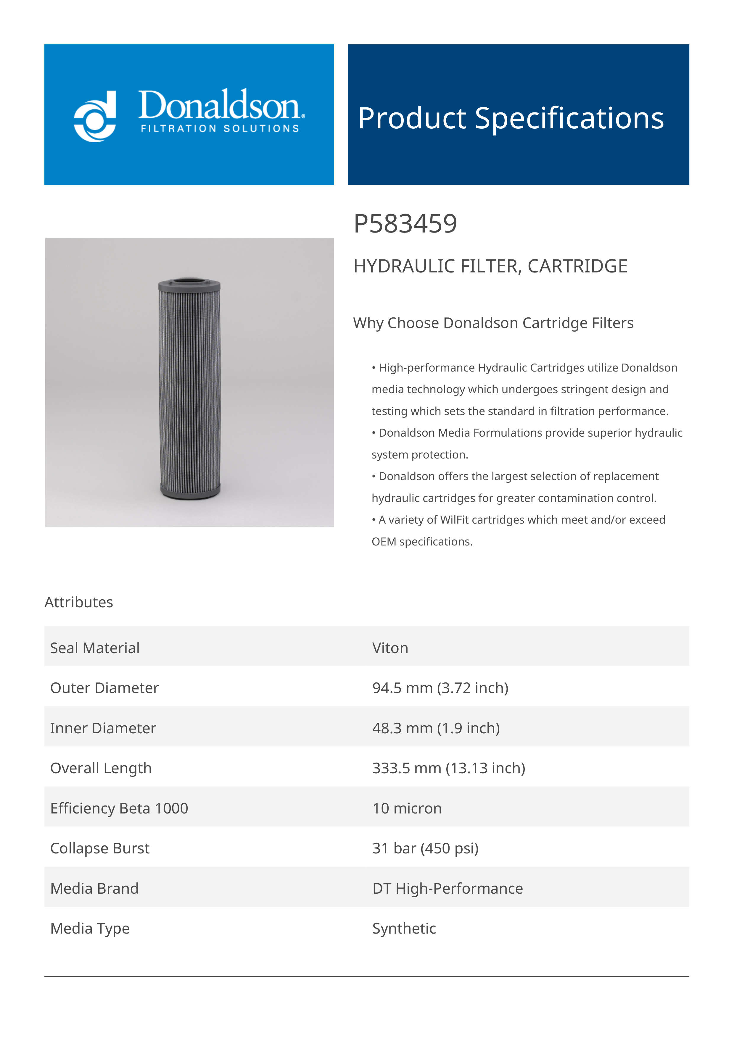 Genuine Donaldson P583459 Hydraulic Filter, Cartridge is designed to provide superior protection for your hydraulic system, effectively capturing contaminants to ensure clean fluid circulation. With high-quality filtration media, it extends equipment life, improves operational efficiency, and maintains fluid cleanliness even in the most demanding environments.Built for industrial, agricultural, and heavy-duty applications, this filter offers excellent dirt-holding capacity and flow efficiency. Its easy installation and maintenance help reduce downtime, making it a reliable choice for keeping hydraulic systems running smoothly.