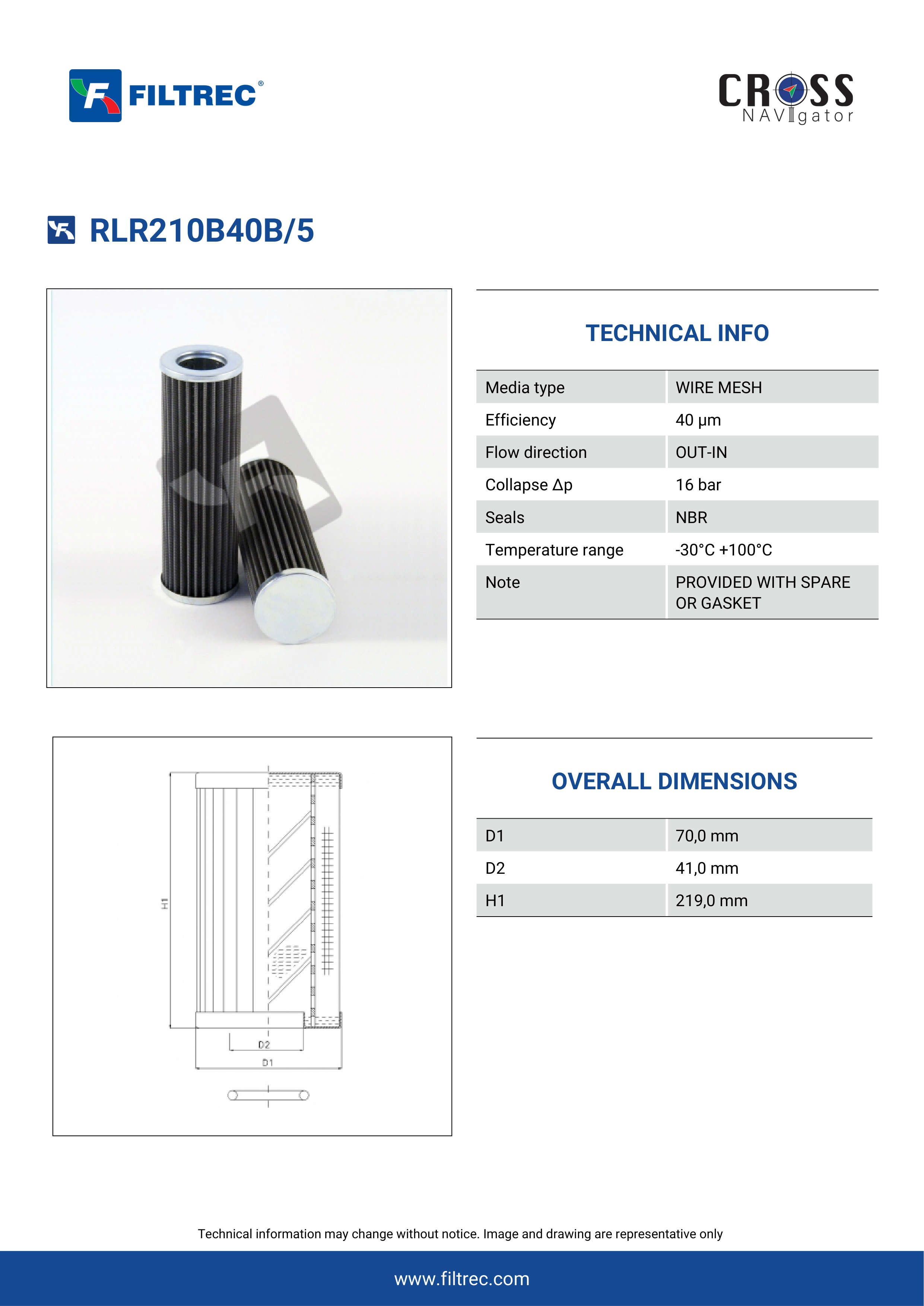 Genuine Filtrec RLR210B40B/5. This Filtrec element is designed to meet or exceed the quality and performance of brand OEM’s ensuring superior filtration performance and long-lasting durability.