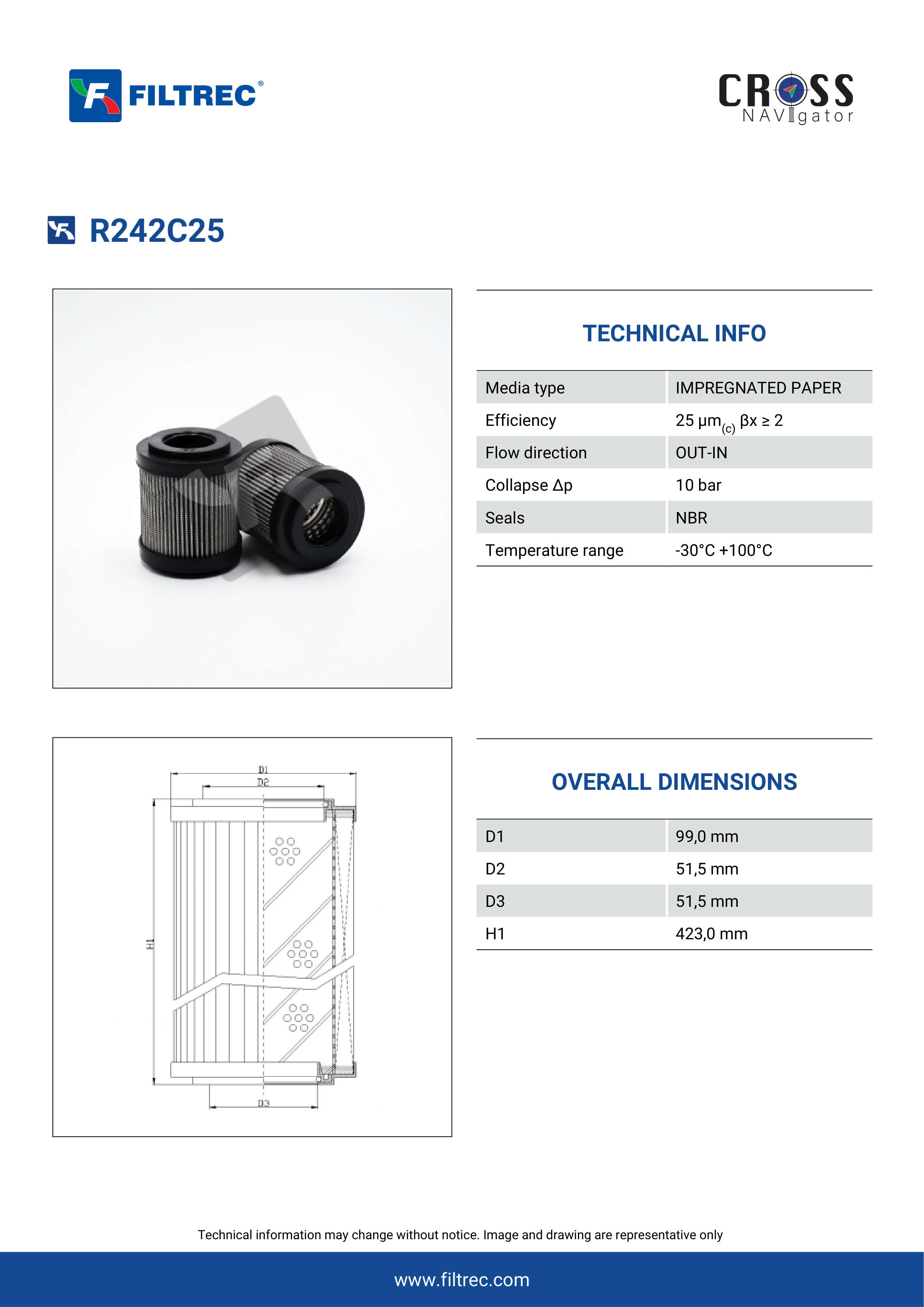 The efficiency of the element is shown using the Micron (µ) and Beta (β) ratings. The micron rating indicates the size of the particle being filtered and the beta rating the efficiency, calculated as 1/β.