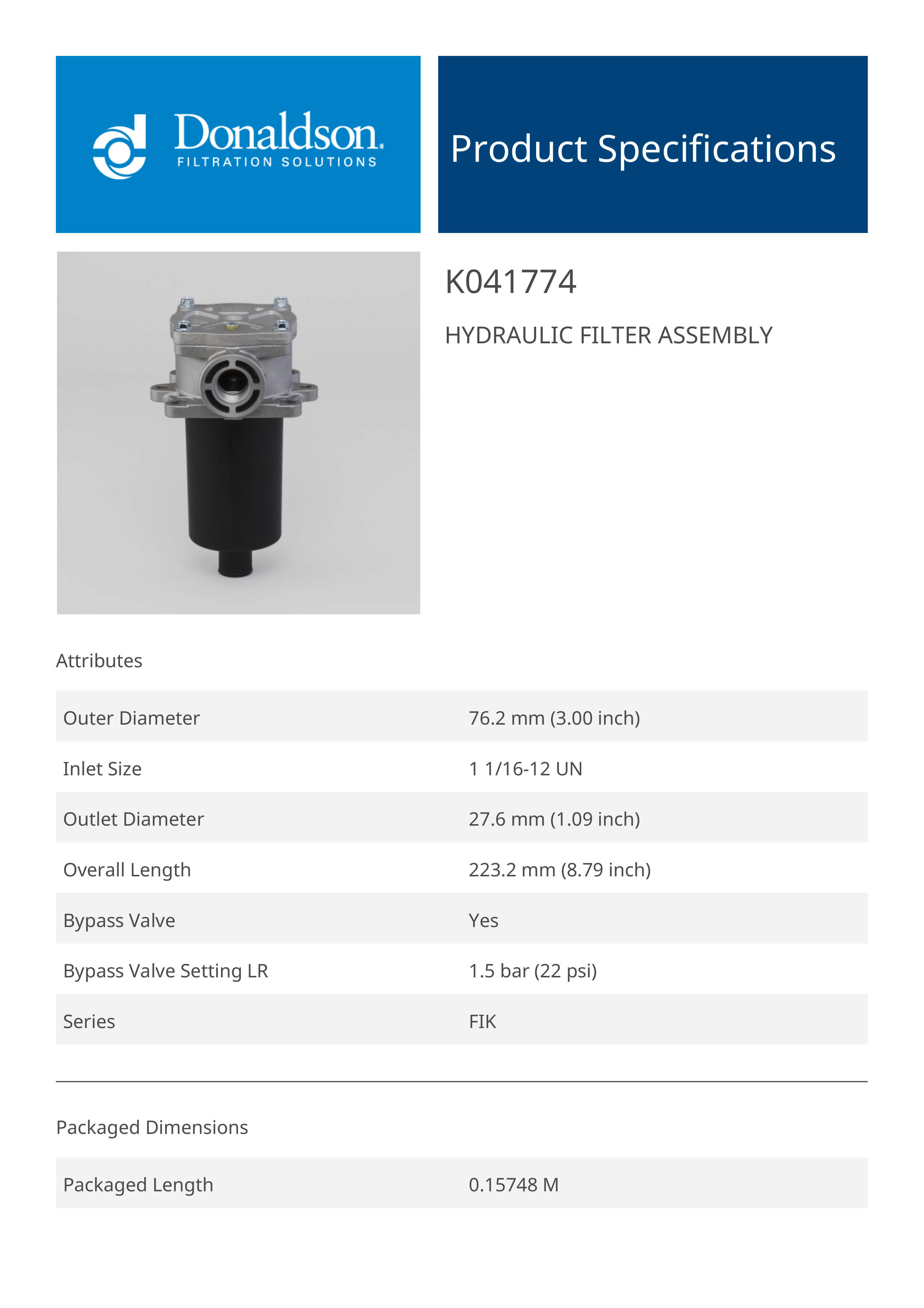 Donaldson K041774 Hydraulic Filter Assembly