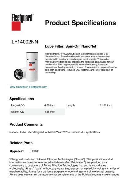 Fleetguard® LF14002NN lube spin-on filter features uses 2-in-1 NanoNet® and StrataPore® media to create a combination filter developed to meet or exceed engine requirements. This media manufacturing technology provides the following advantages for our combination filter: higher particle removal efficiency, increased contaminant holding capacity, reduced flow restriction, especially under cold-start conditions, reduced CO2 footprint, and lower total cost of ownership.Specification