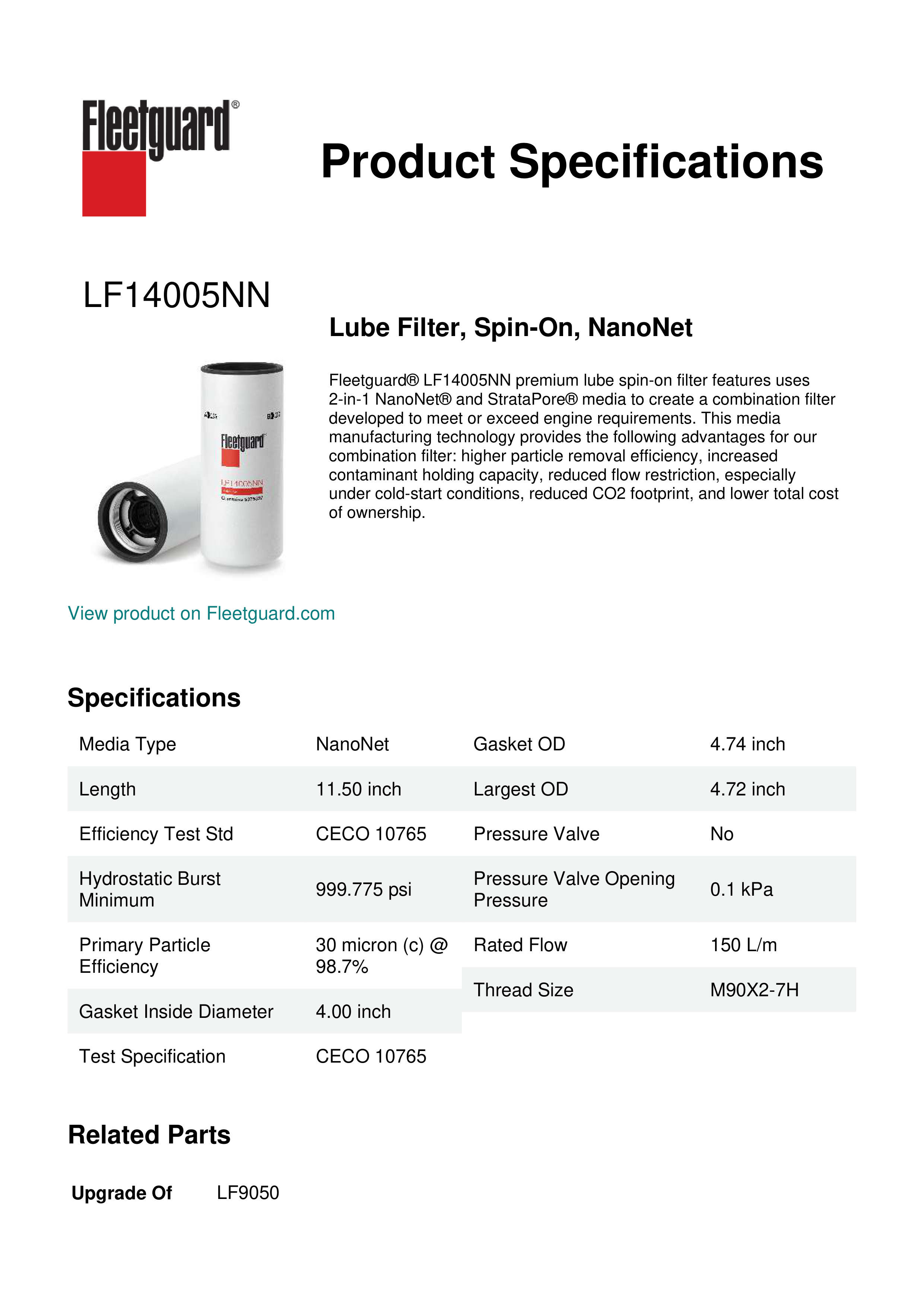 Fleetguard® LF14005NN premium lube spin-on filter features uses 2-in-1 NanoNet® and StrataPore® media to create a combination filter developed to meet or exceed engine requirements. This media manufacturing technology provides the following advantages for our combination filter: higher particle removal efficiency, increased contaminant holding capacity, reduced flow restriction, especially under cold-start conditions, reduced CO2 footprint, and lower total cost of ownership.Specification