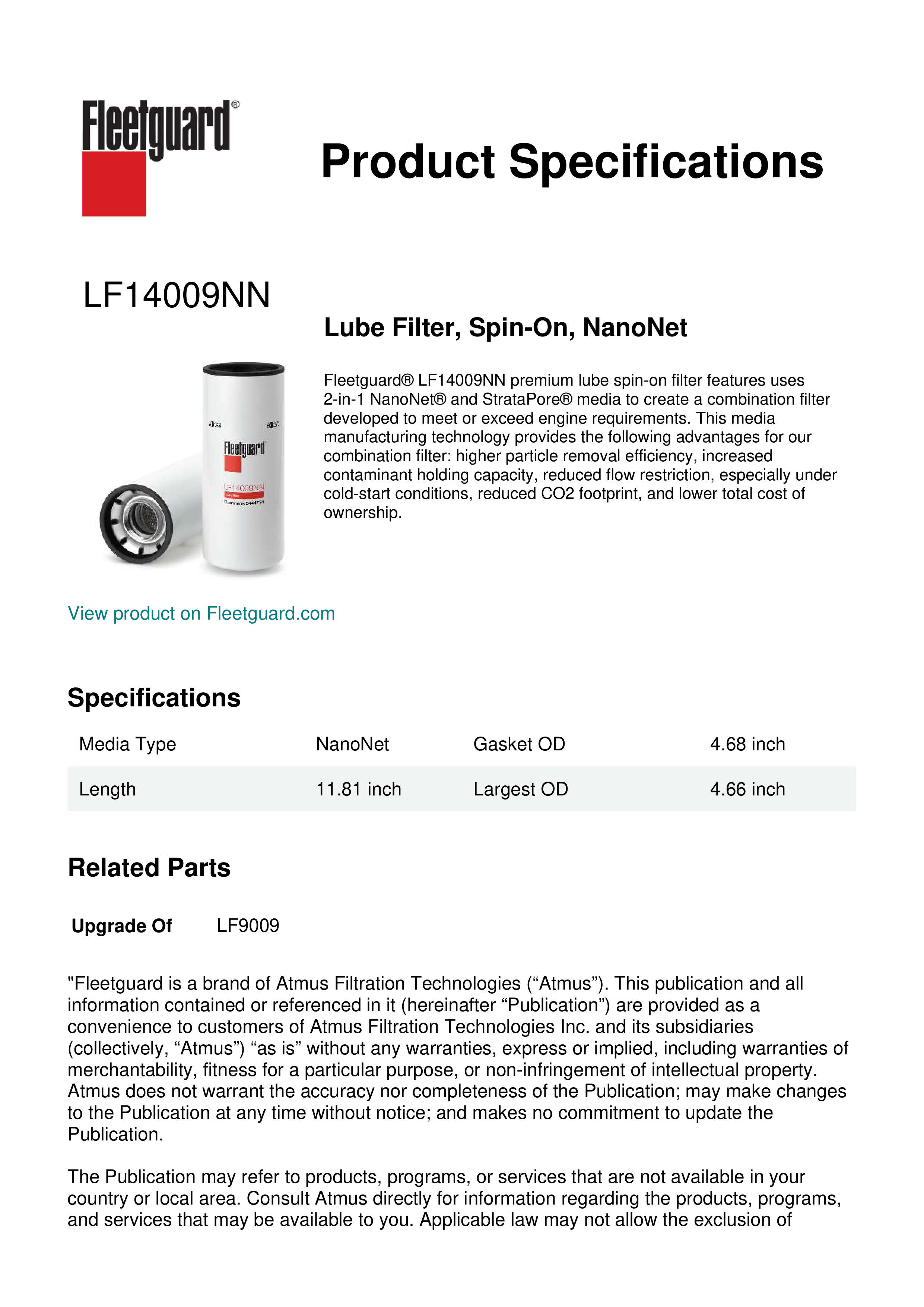 Fleetguard® LF14009NN premium lube spin-on filter features uses 2-in-1 NanoNet® and StrataPore® media to create a combination filter developed to meet or exceed engine requirements. This media manufacturing technology provides the following advantages for our combination filter: higher particle removal efficiency, increased contaminant holding capacity, reduced flow restriction, especially under cold-start conditions, reduced CO2 footprint, and lower total cost of ownership.