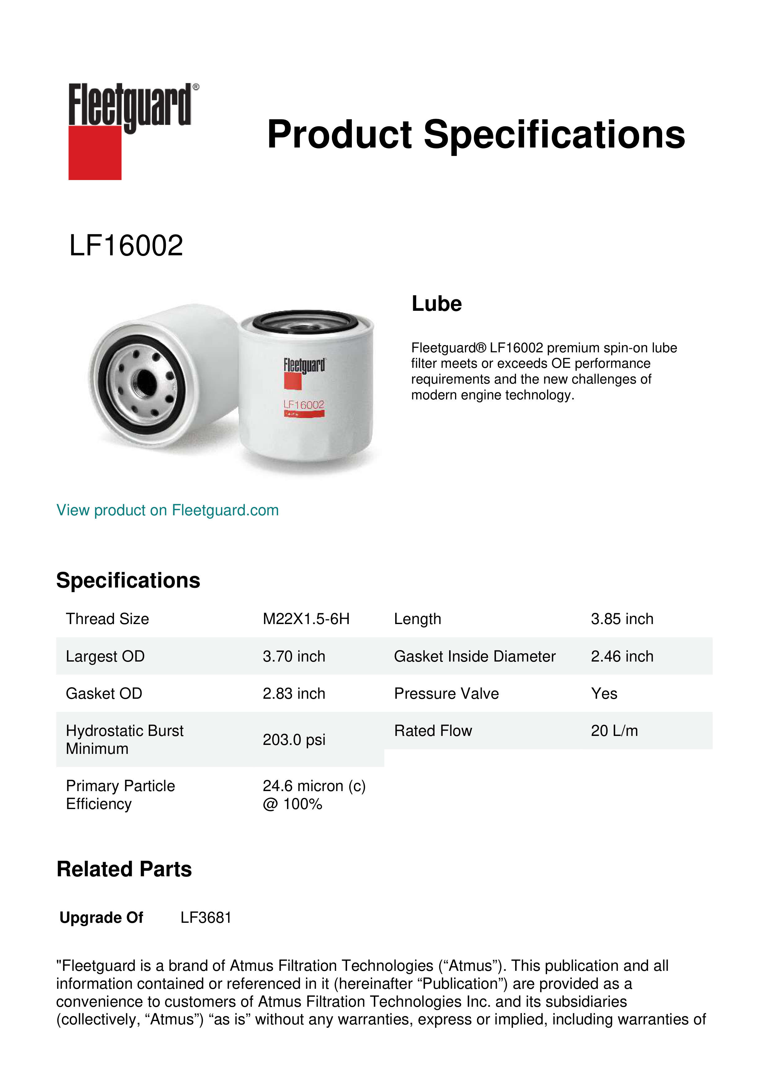 Fleetguard® LF16002 premium spin-on lube filter meets or exceeds OE performance requirements and the new challenges of modern engine technology.Specification