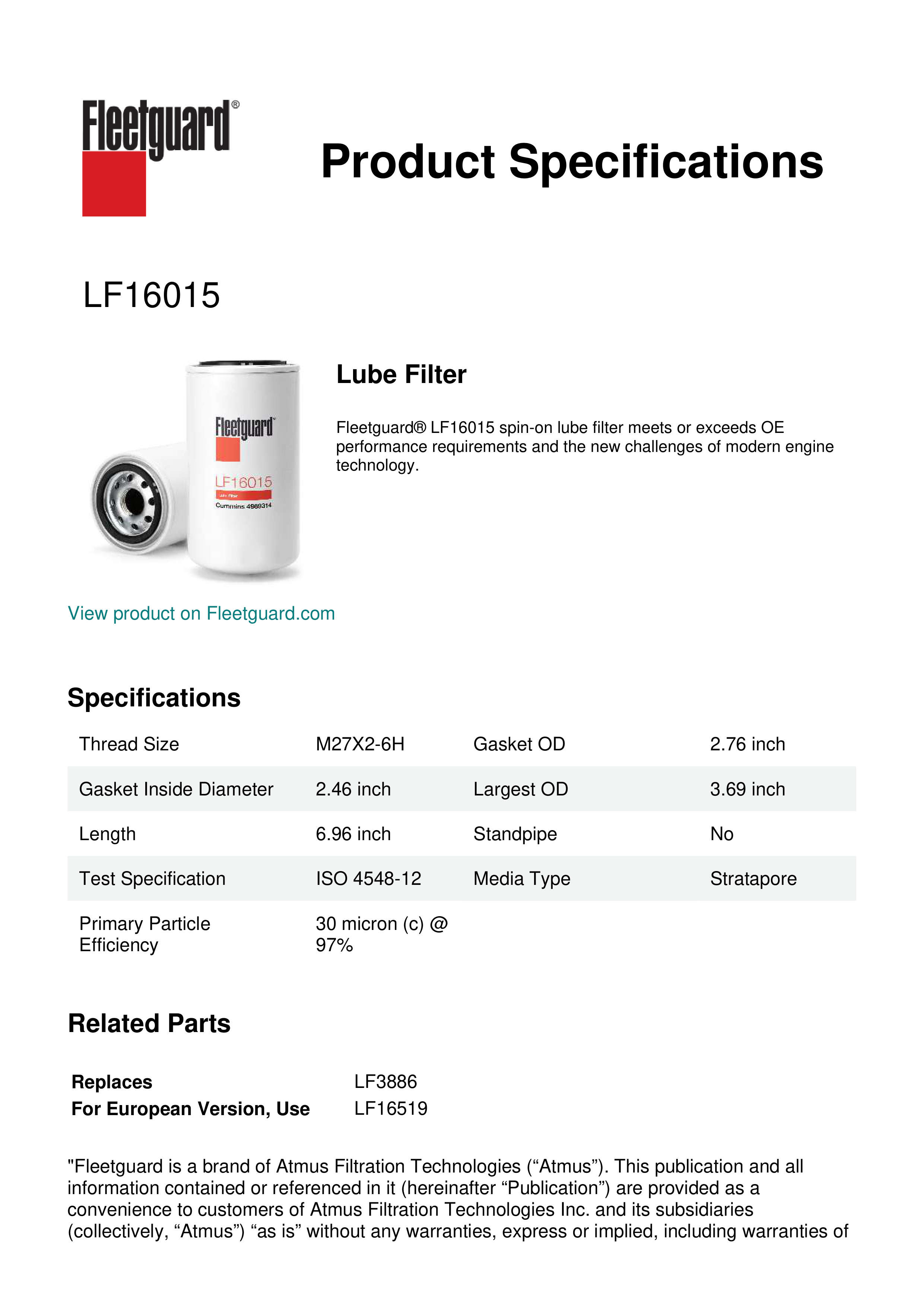 Fleetguard® LF16015 spin-on lube filter meets or exceeds OE performance requirements and the new challenges of modern engine technology.Specification