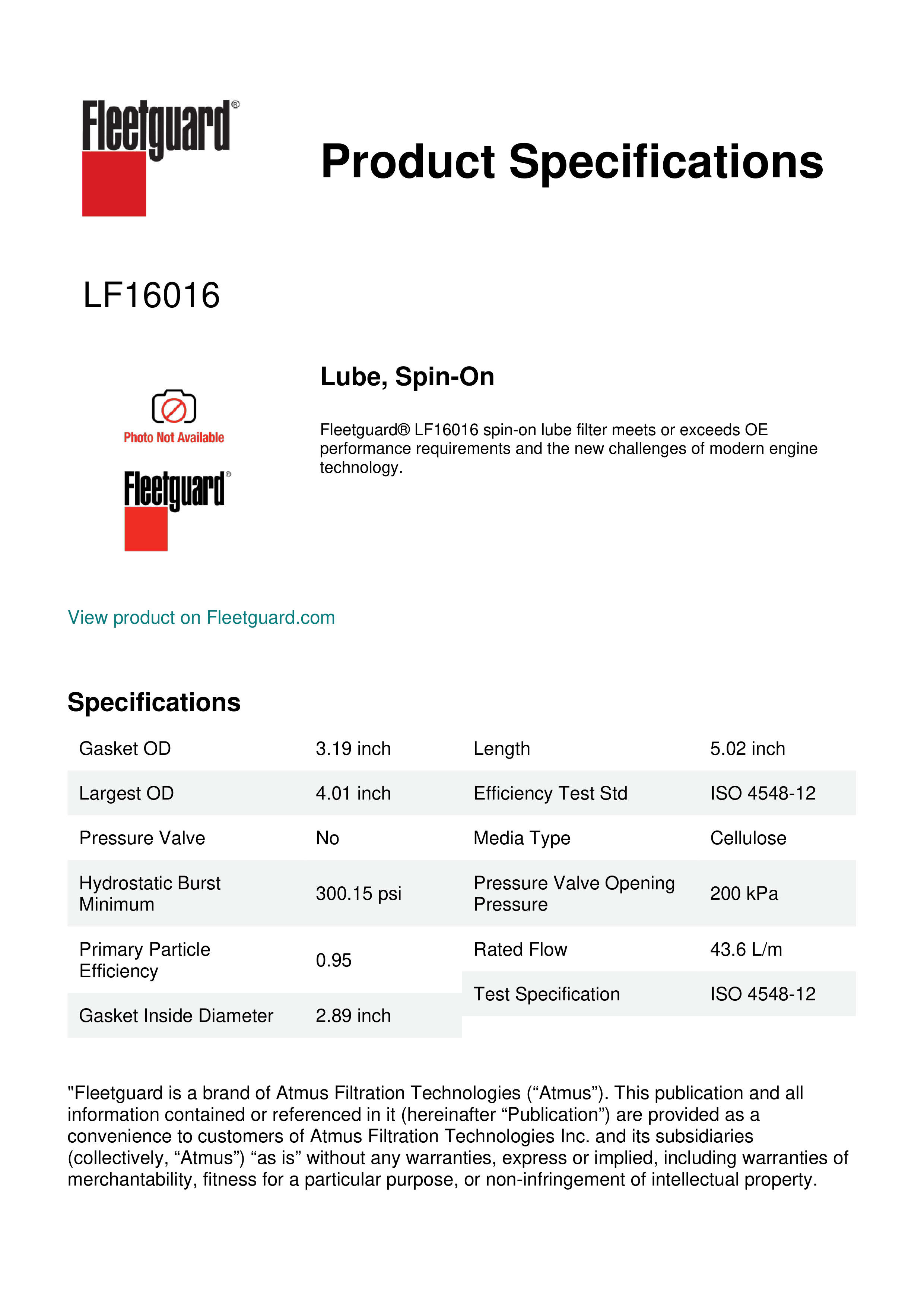 Fleetguard® LF16016 spin-on lube filter meets or exceeds OE performance requirements and the new challenges of modern engine technology.Specification