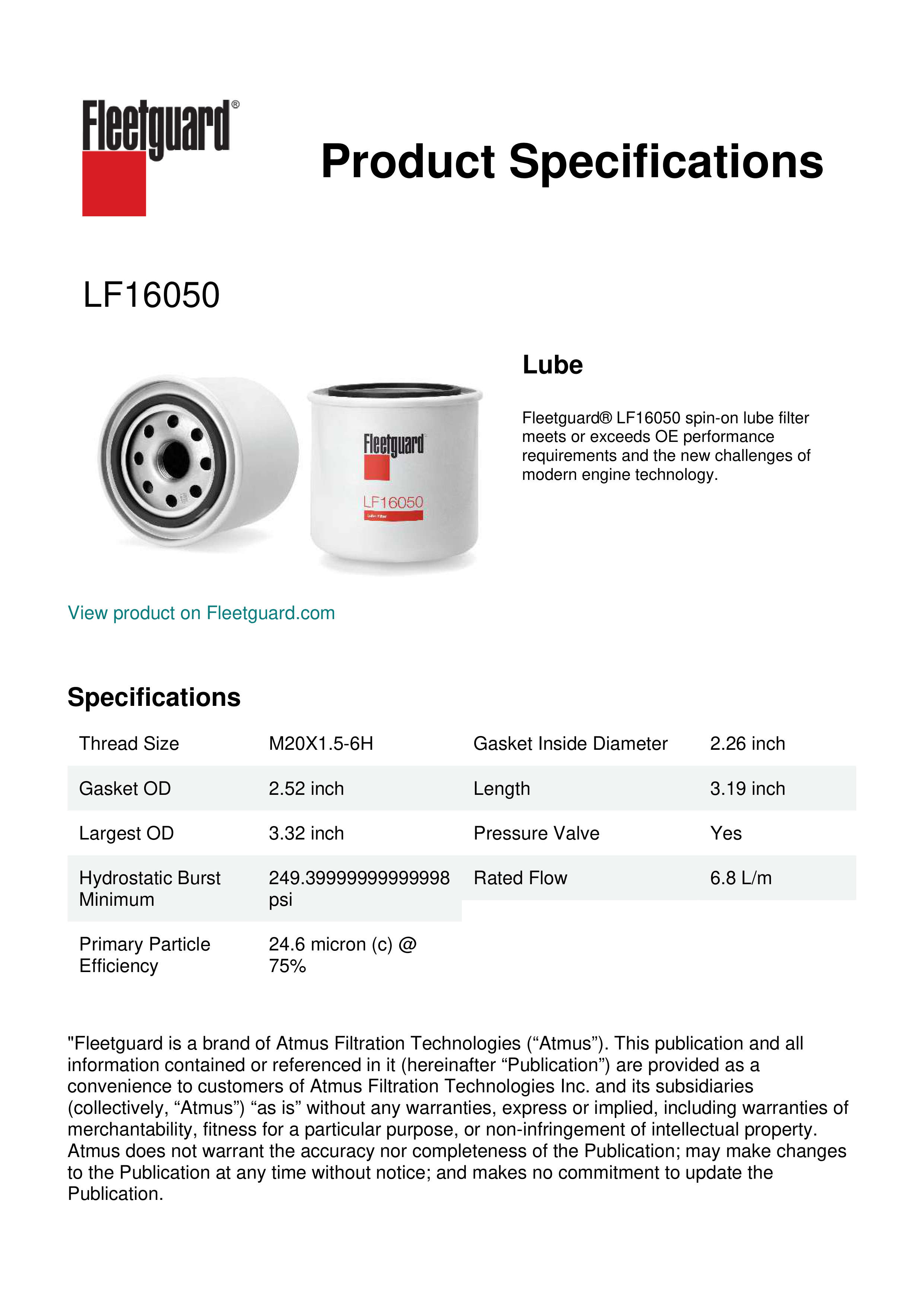 Fleetguard® LF16050 spin-on lube filter meets or exceeds OE performance requirements and the new challenges of modern engine technology.Specification