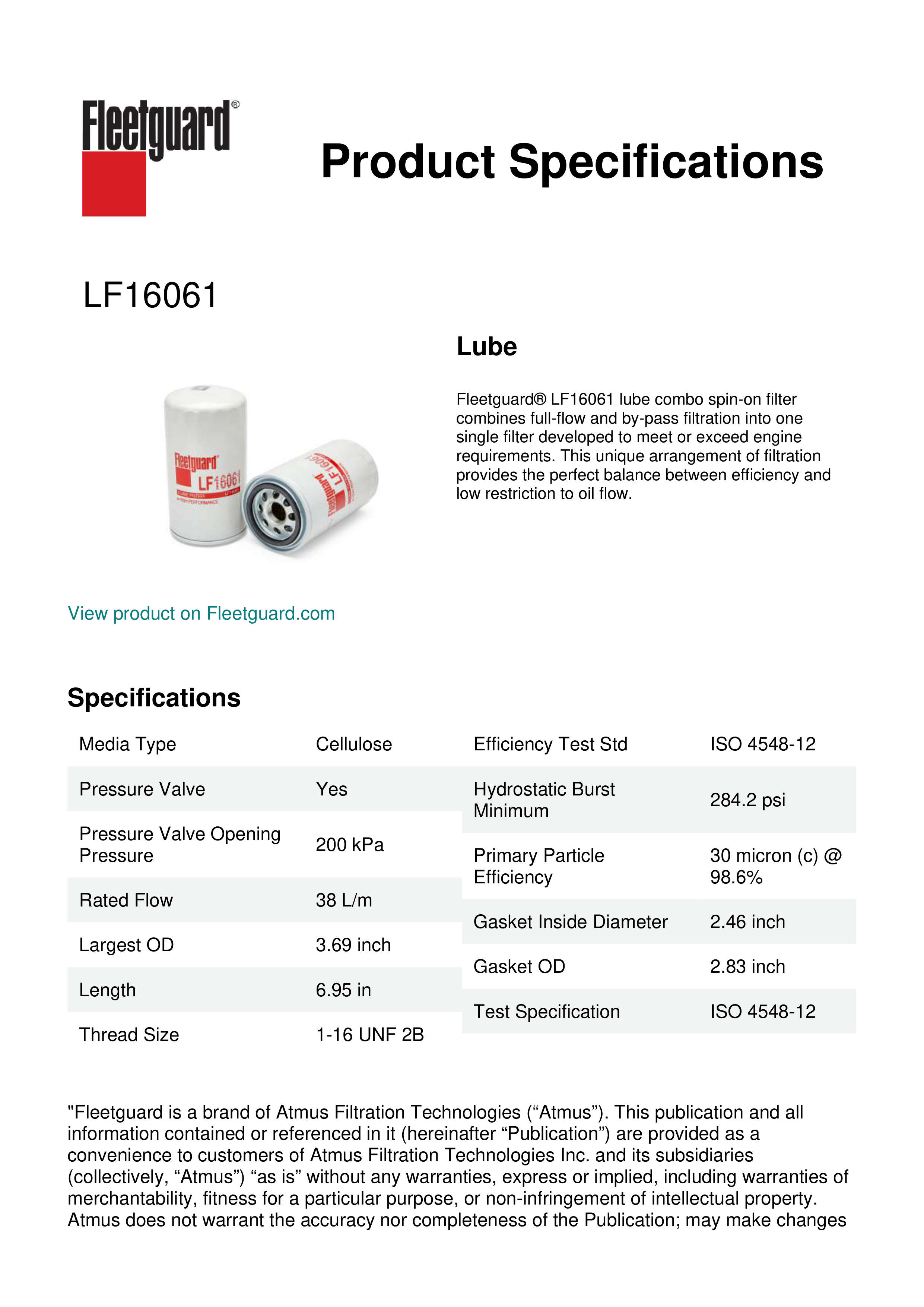 Fleetguard® LF16061 lube combo spin-on filter combines full-flow and by-pass filtration into one single filter developed to meet or exceed engine requirements. This unique arrangement of filtration provides the perfect balance between efficiency and low restriction to oil flow.Specification