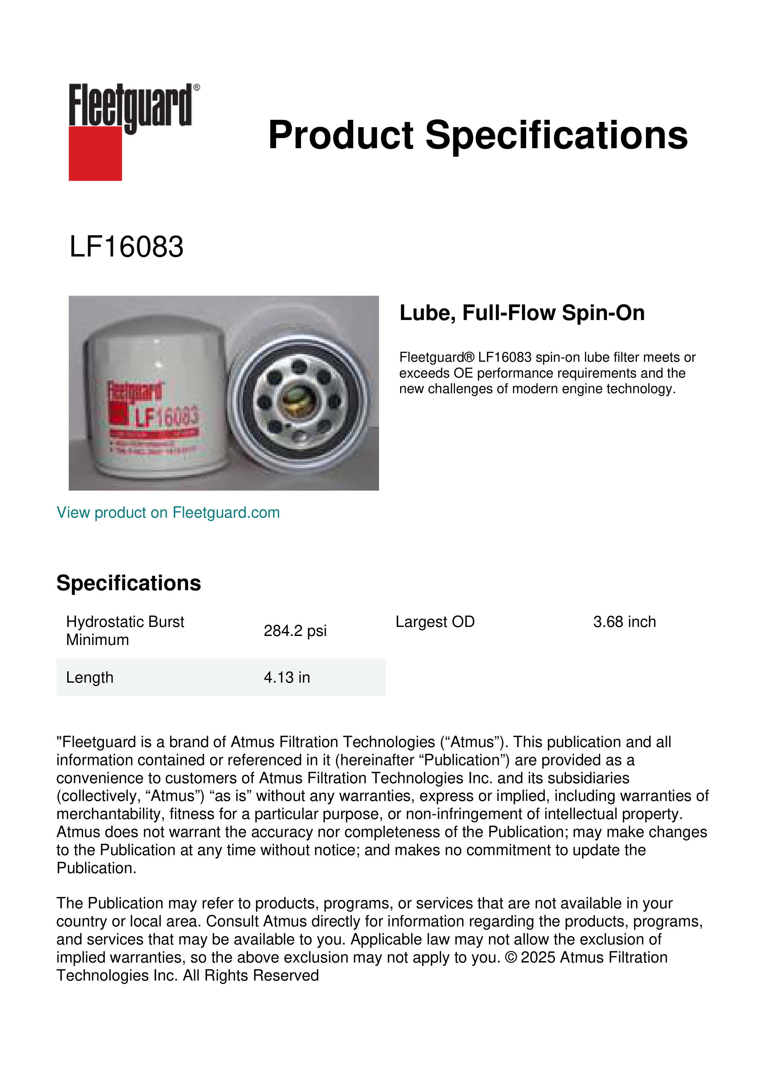 Fleetguard® LF16083 spin-on lube filter meets or exceeds OE performance requirements and the new challenges of modern engine technology.Specification
