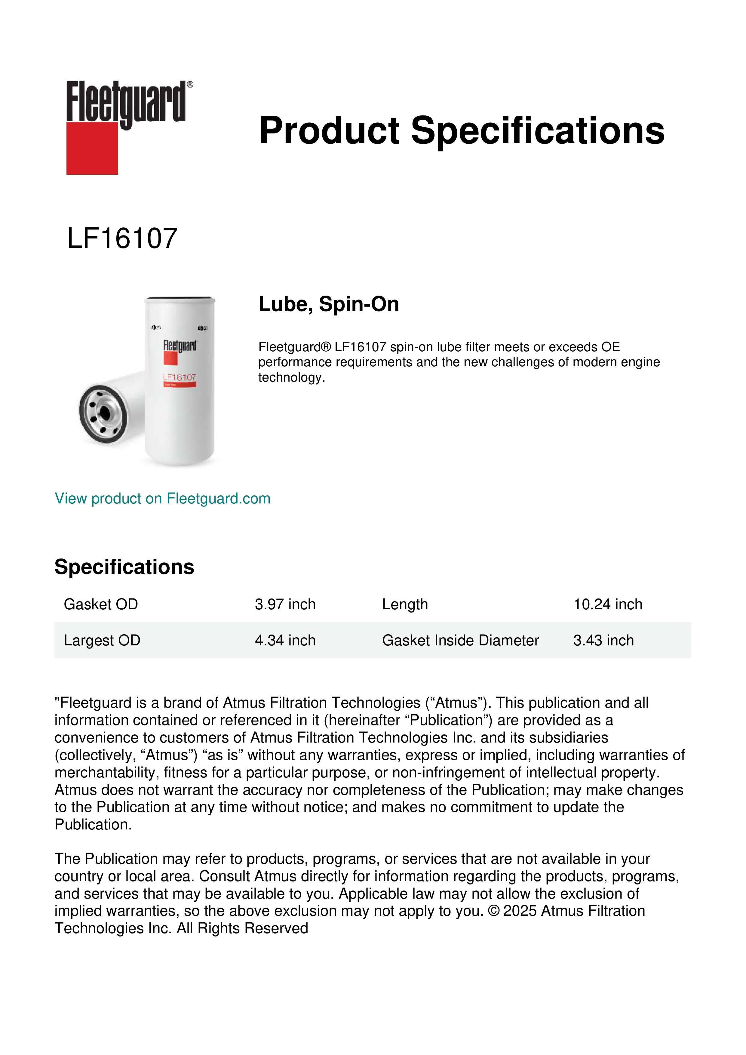 Fleetguard® LF16107 spin-on lube filter meets or exceeds OE performance requirements and the new challenges of modern engine technology.Specification