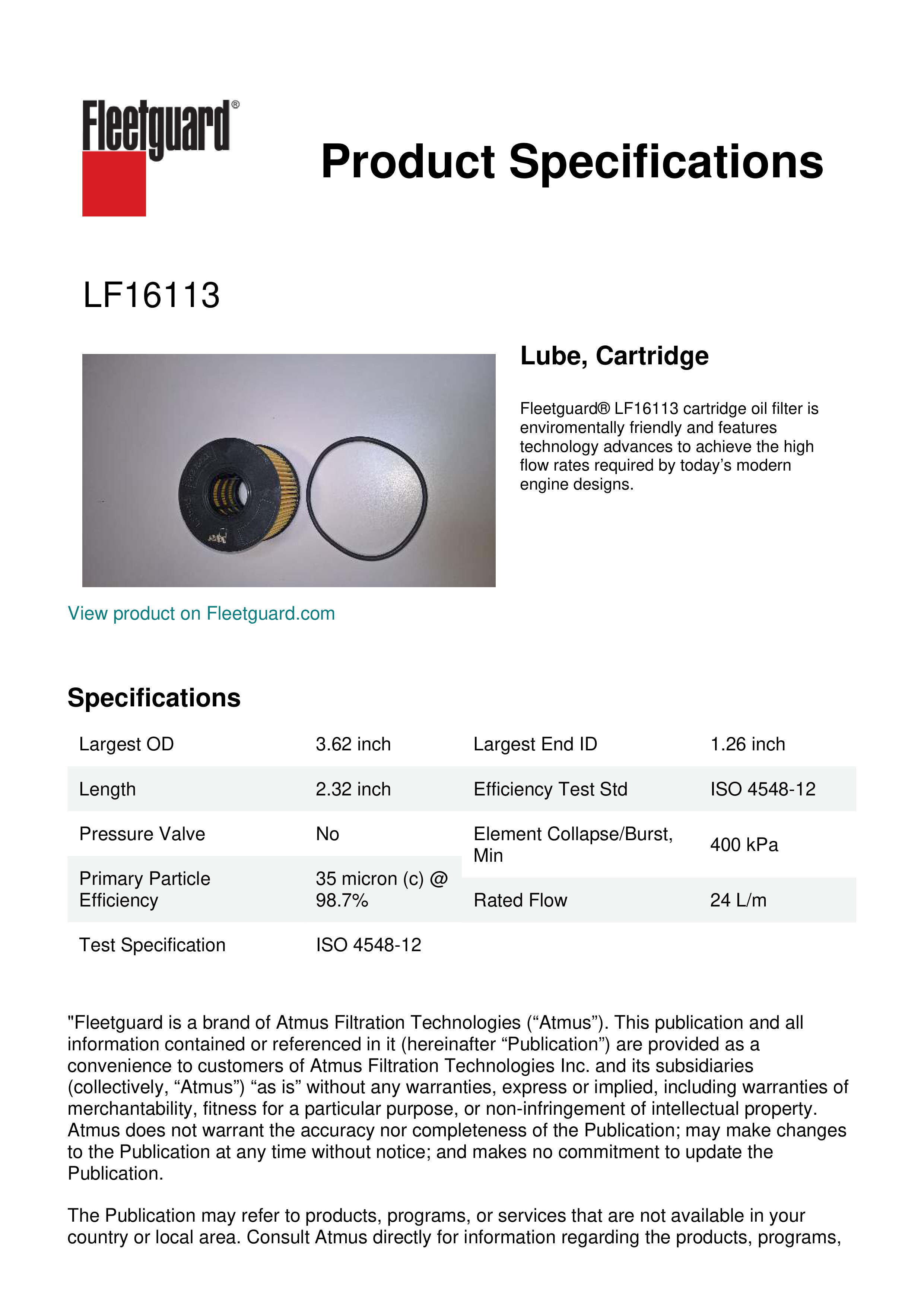 Fleetguard® LF16113 cartridge oil filter is enviromentally friendly and features technology advances to achieve the high flow rates required by today’s modern engine designs.