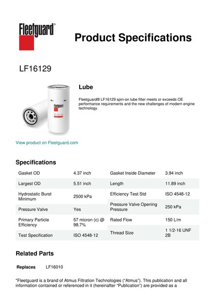 Fleetguard® LF16129 spin-on lube filter meets or exceeds OE performance requirements and the new challenges of modern engine technology.Specification