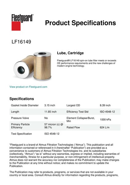 Fleetguard® LF16149 spin-on lube filter meets or exceeds OE performance requirements and the new challenges of modern engine technology.Specification