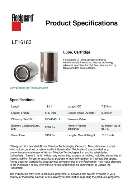 Fleetguard® LF16183 cartridge oil filter is environmentally friendly and features technology advances to achieve the high flow rates required by today’s modern engine designs.Specification