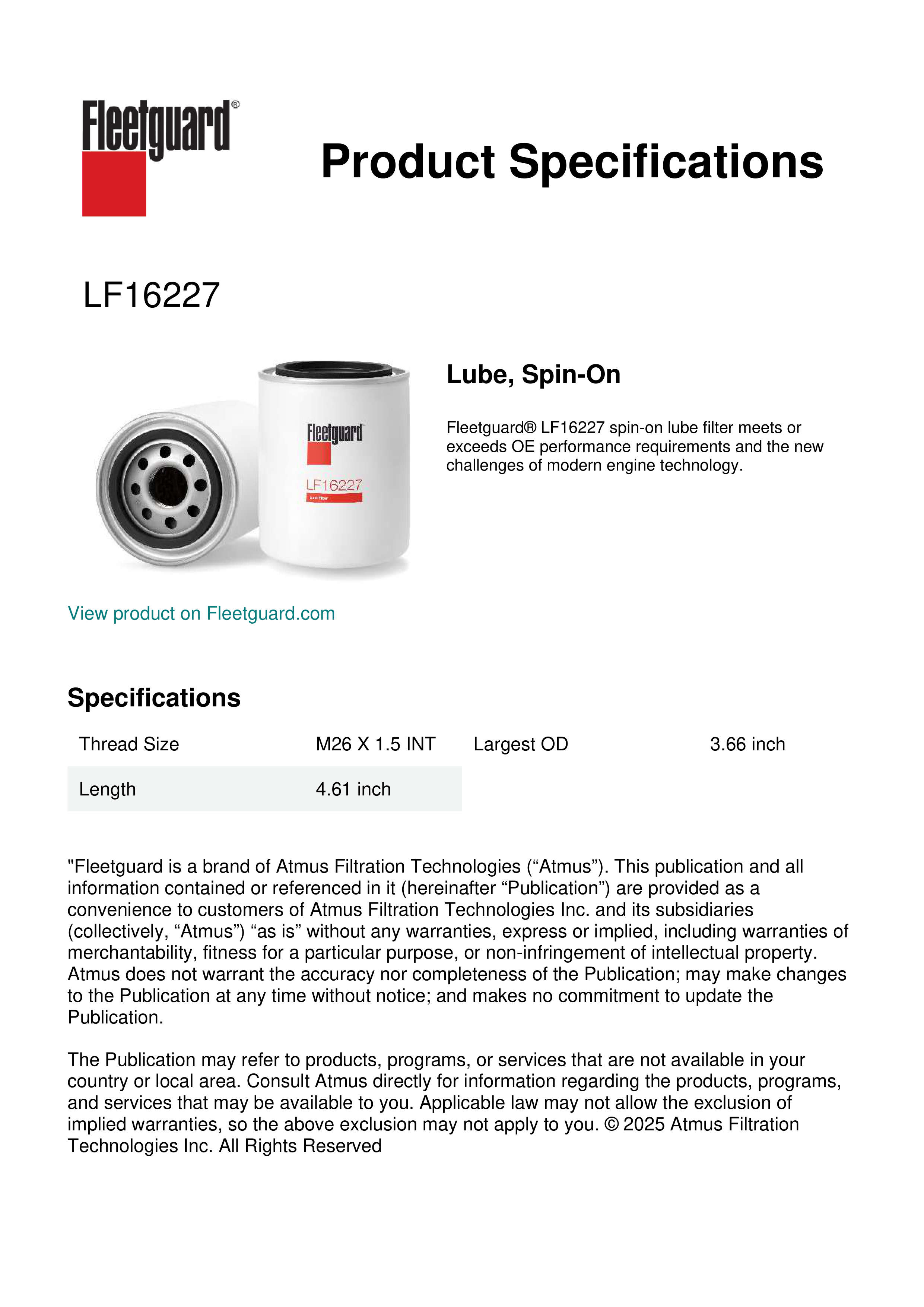 Fleetguard® LF16227 spin-on lube filter meets or exceeds OE performance requirements and the new challenges of modern engine technology.Specification