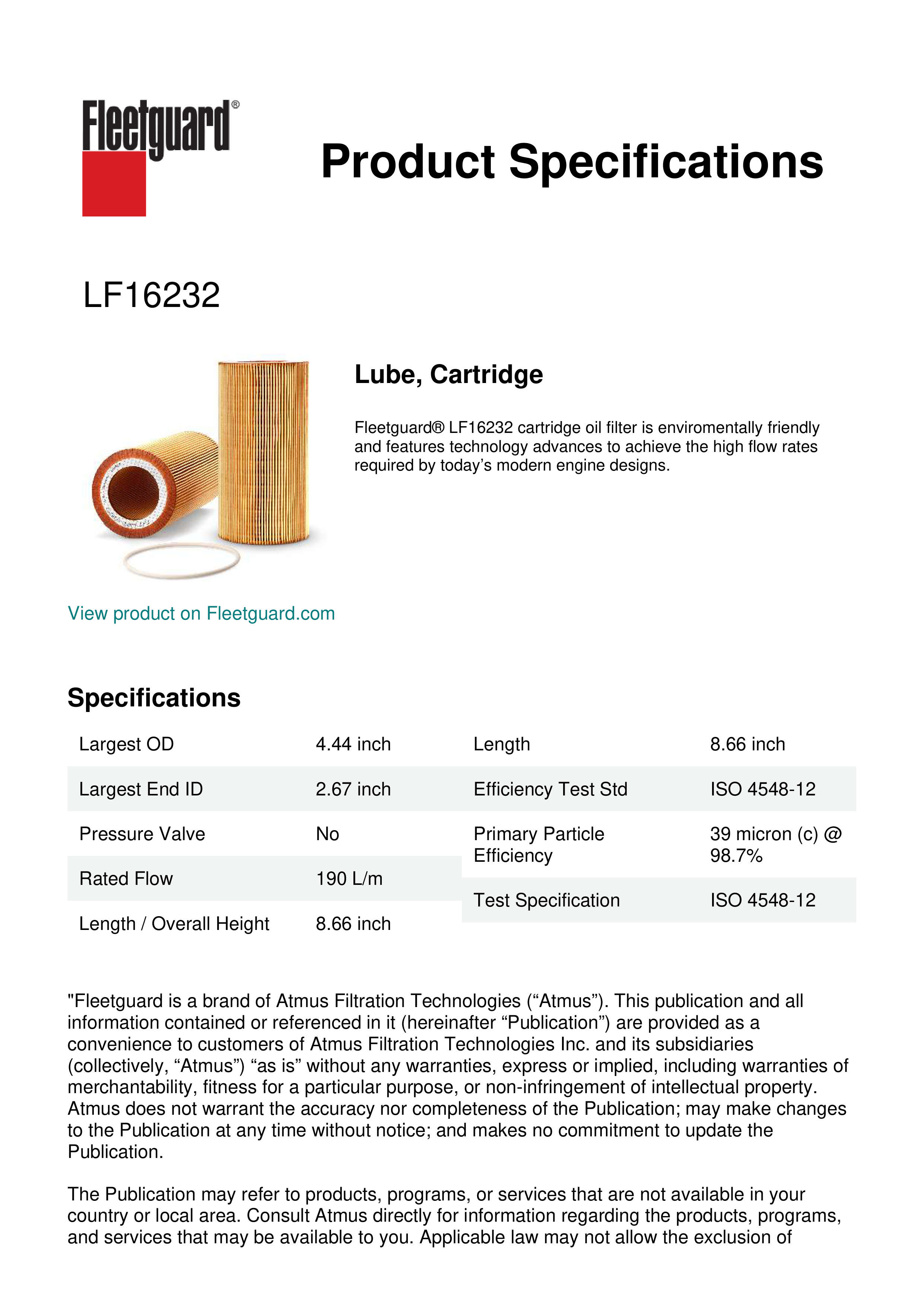 Fleetguard® LF16232 cartridge oil filter is enviromentally friendly and features technology advances to achieve the high flow rates required by today’s modern engine designs.Specification