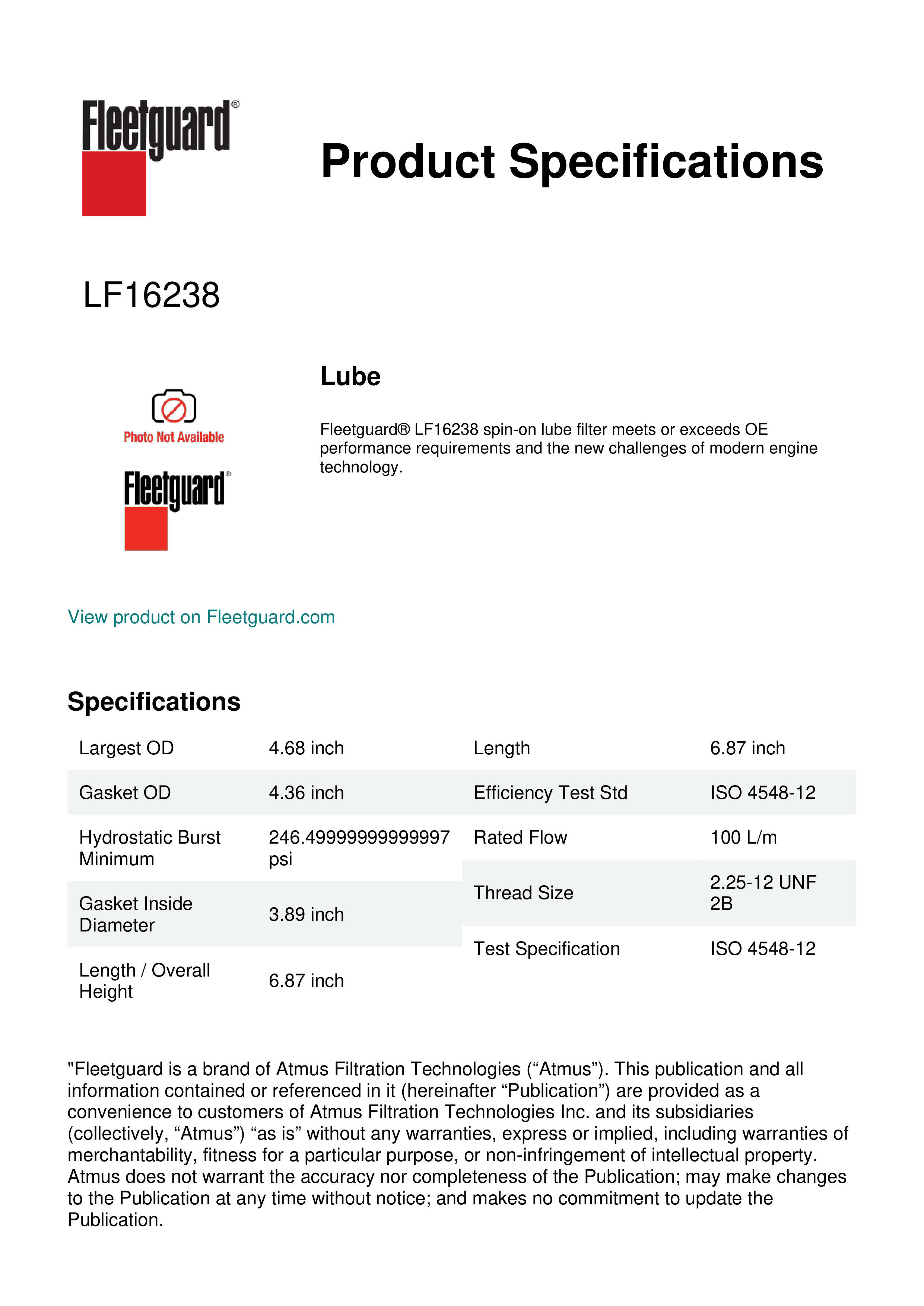 Fleetguard® LF16238 spin-on lube filter meets or exceeds OE performance requirements and the new challenges of modern engine technology.Specification