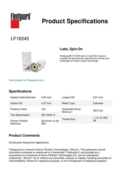 Fleetguard® LF16245 spin-on lube filter meets or exceeds OE performance requirements and the new challenges of modern engine technology.Specification