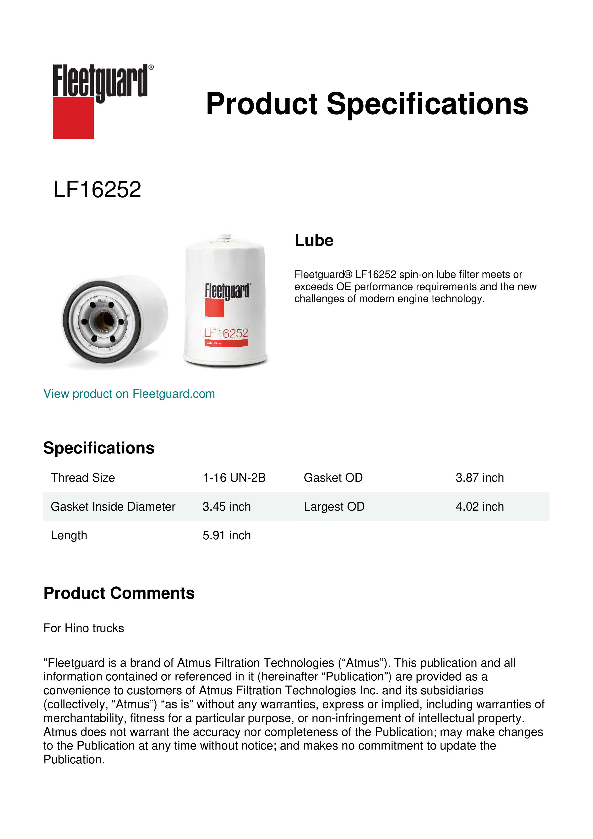 Fleetguard® LF16252 spin-on lube filter meets or exceeds OE performance requirements and the new challenges of modern engine technology.Specification