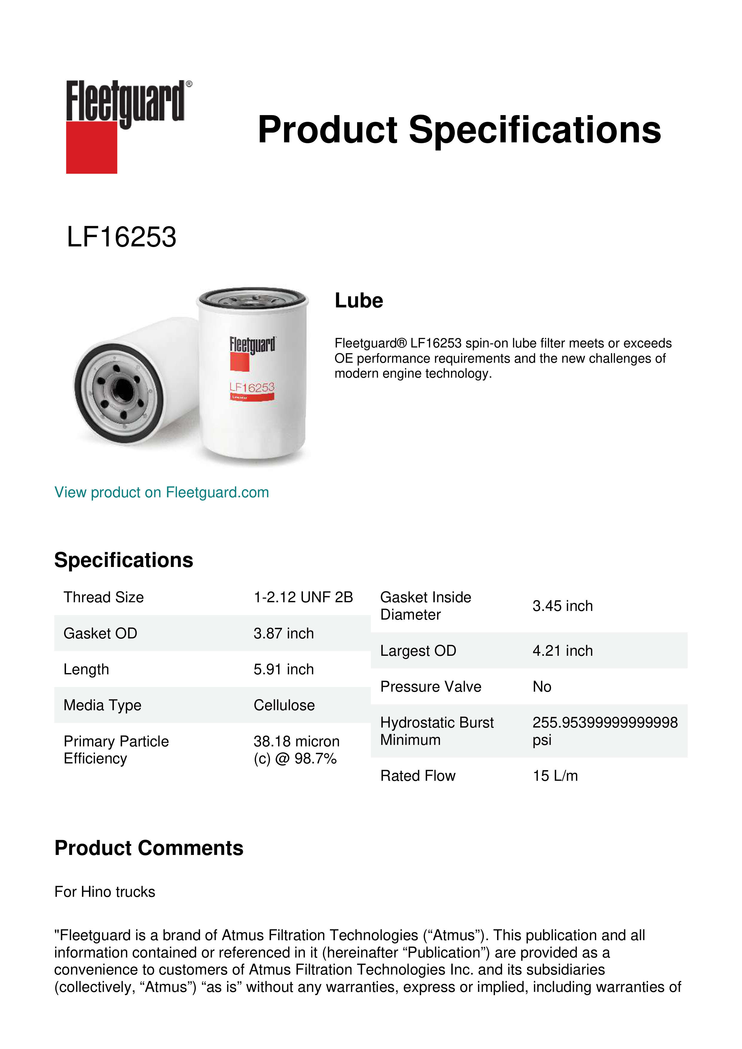 Fleetguard® LF16253 spin-on lube filter meets or exceeds OE performance requirements and the new challenges of modern engine technology.Specification