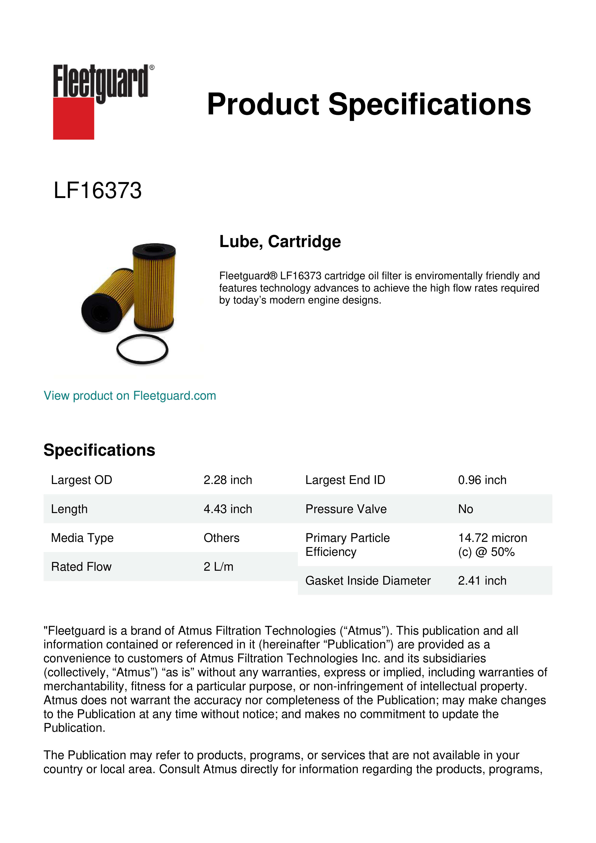 Fleetguard® LF16373 cartridge oil filter is enviromentally friendly and features technology advances to achieve the high flow rates required by today’s modern engine designs.Specification