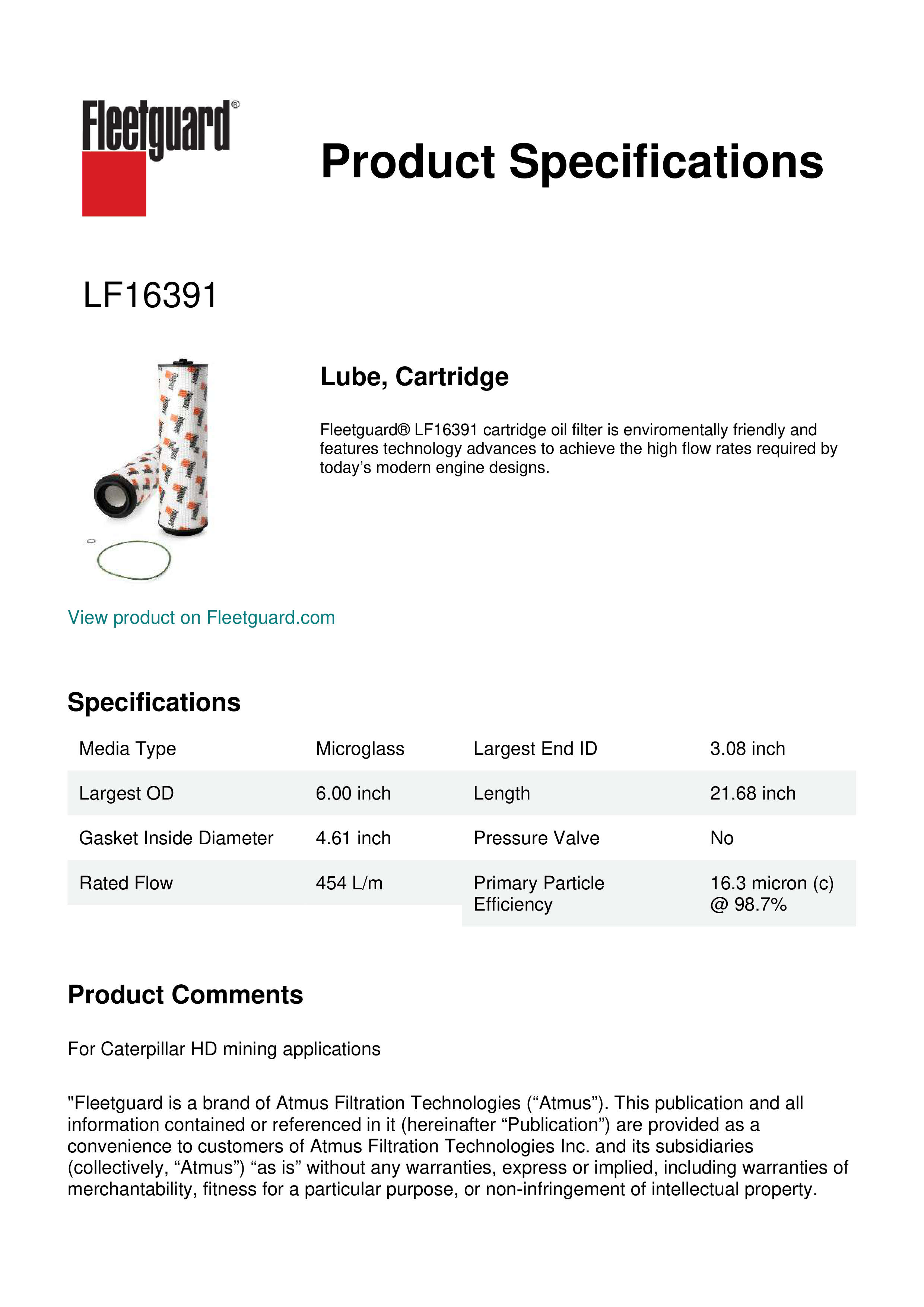 Fleetguard® LF16391 cartridge oil filter is enviromentally friendly and features technology advances to achieve the high flow rates required by today’s modern engine designs.Specification