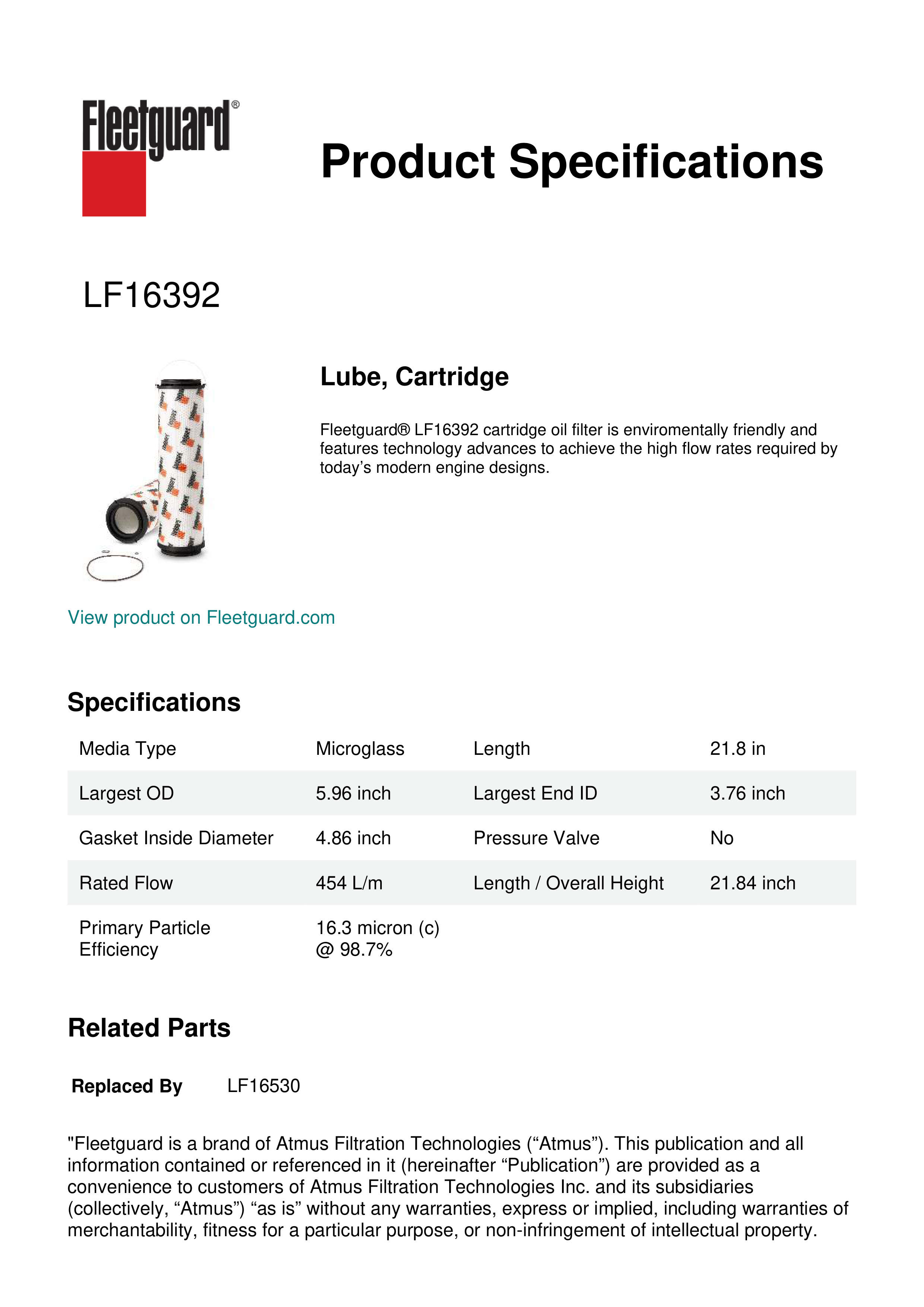 Fleetguard® LF16392 cartridge oil filter is enviromentally friendly and features technology advances to achieve the high flow rates required by today’s modern engine designs.Specification