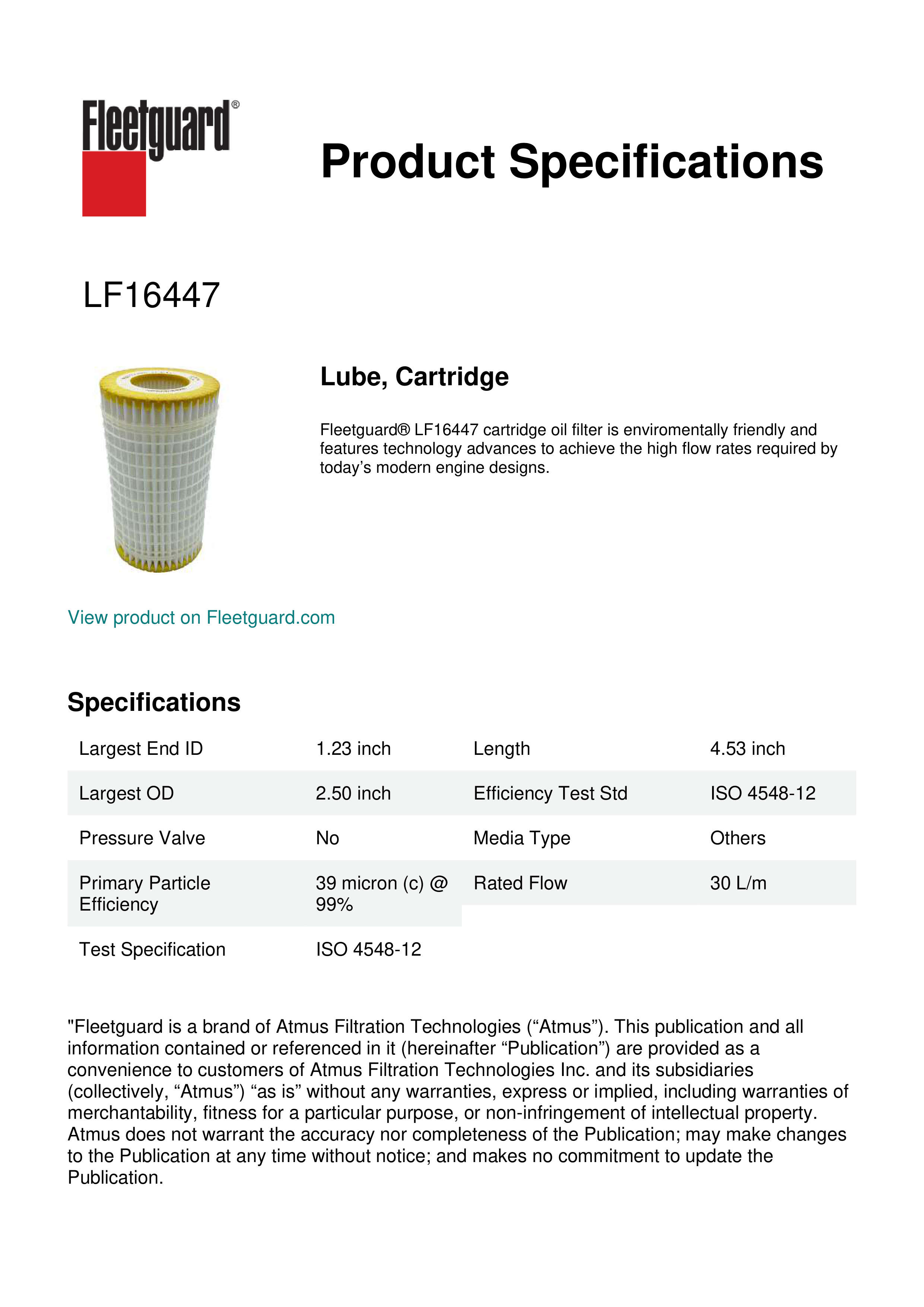 Fleetguard® LF16447 cartridge oil filter is enviromentally friendly and features technology advances to achieve the high flow rates required by today’s modern engine designs.Specification