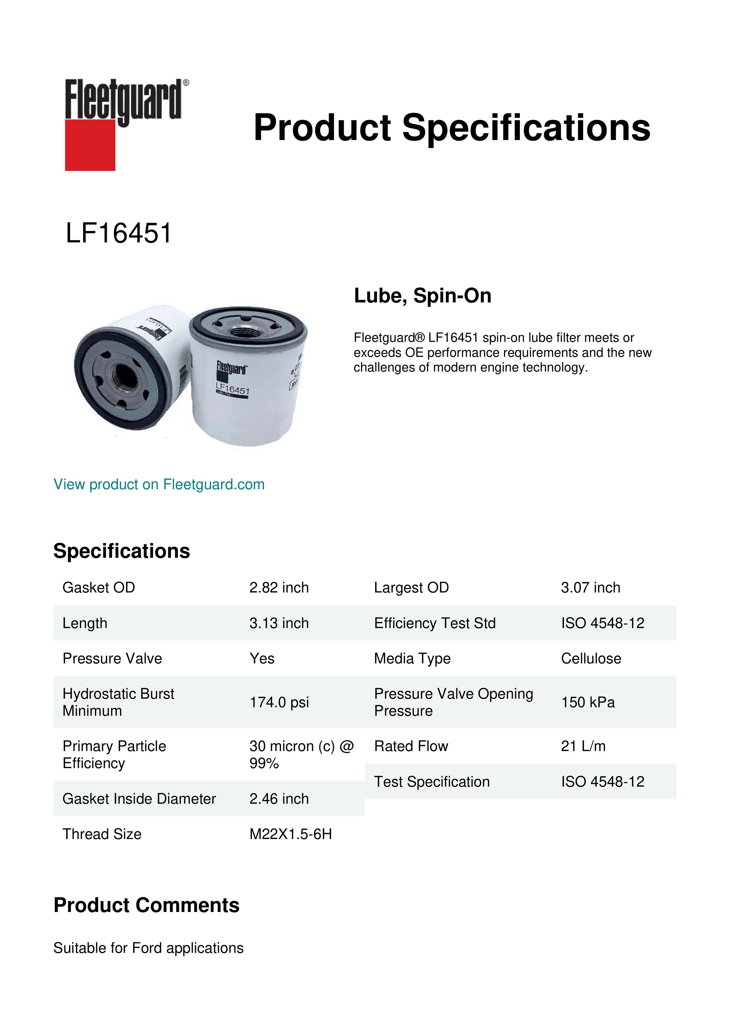 Fleetguard® LF16451 spin-on lube filter meets or exceeds OE performance requirements and the new challenges of modern engine technology.Specification