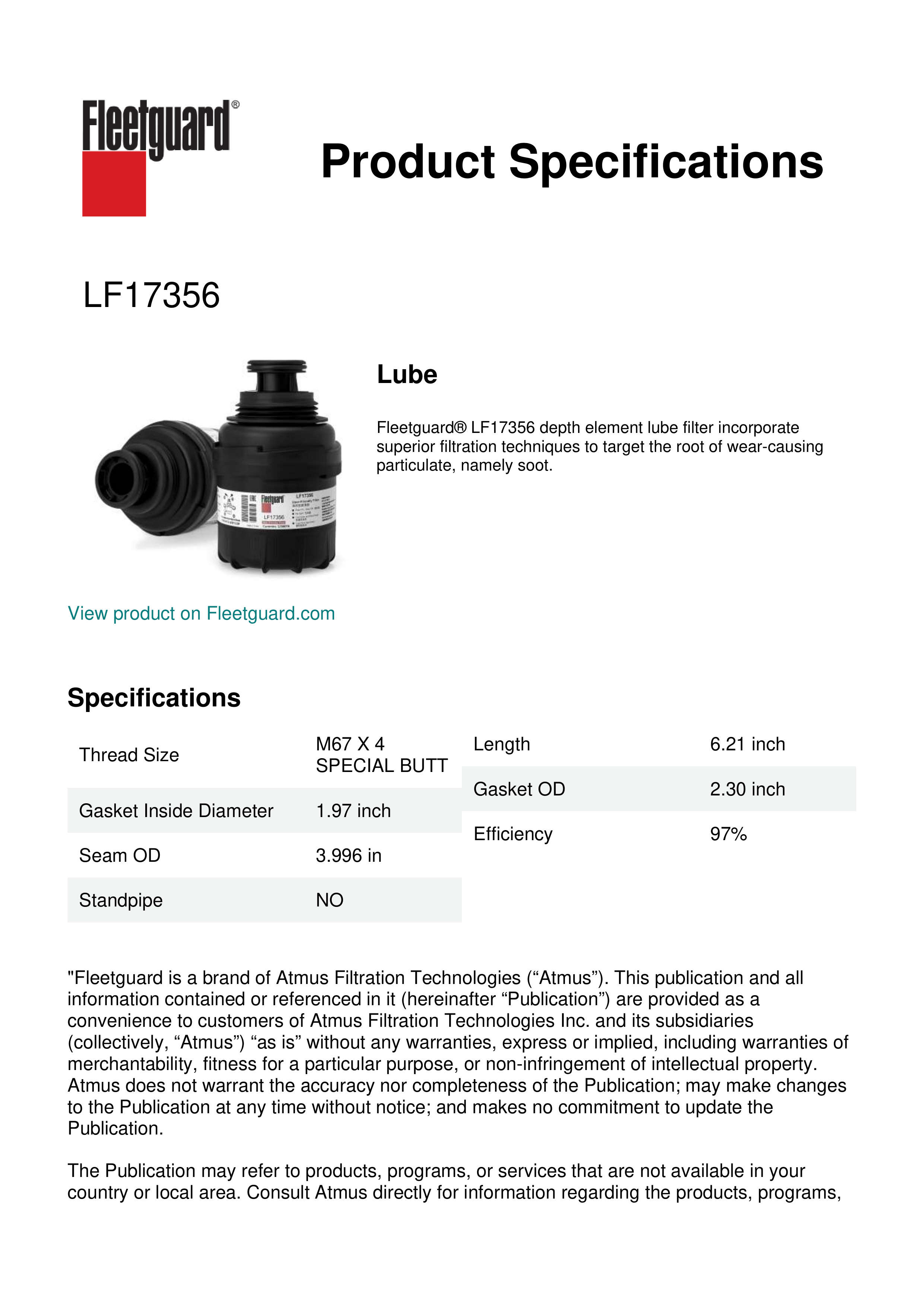 Fleetguard® LF17356 depth element lube filter incorporate superior filtration techniques to target the root of wear-causing particulate, namely soot.Specification