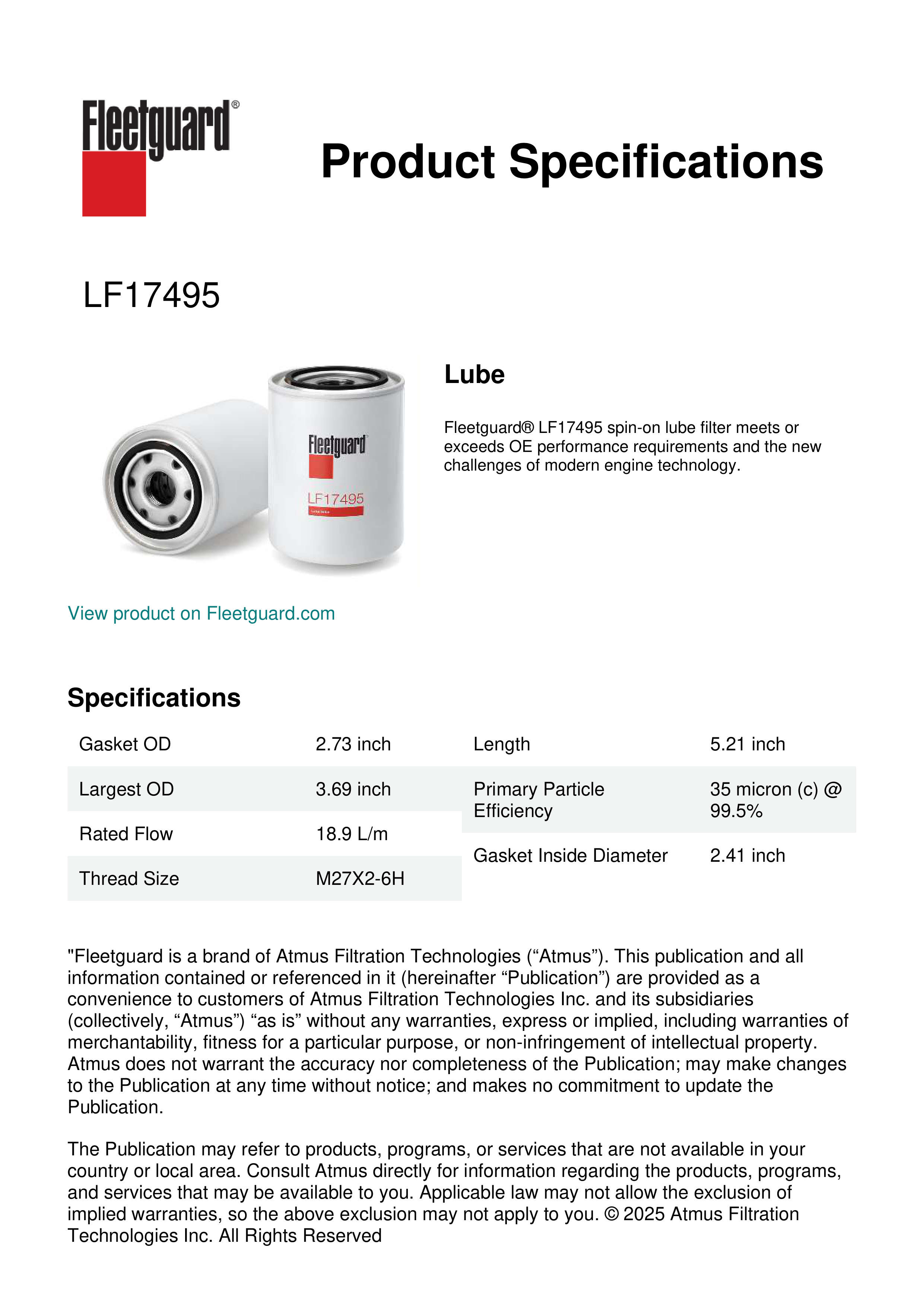 Fleetguard® LF17495 spin-on lube filter meets or exceeds OE performance requirements and the new challenges of modern engine technology.