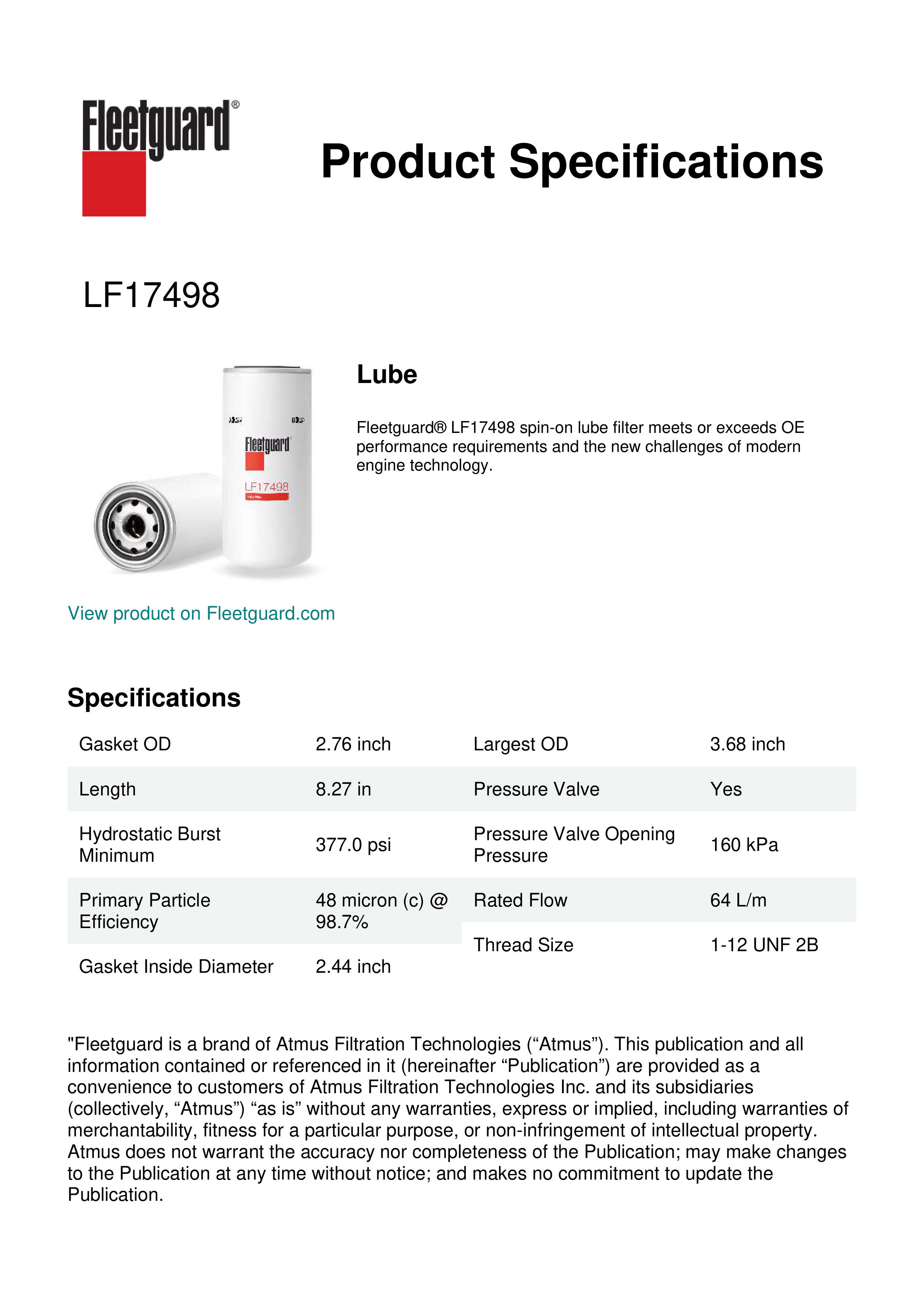 Fleetguard® LF17498 spin-on lube filter meets or exceeds OE performance requirements and the new challenges of modern engine technology.Specification