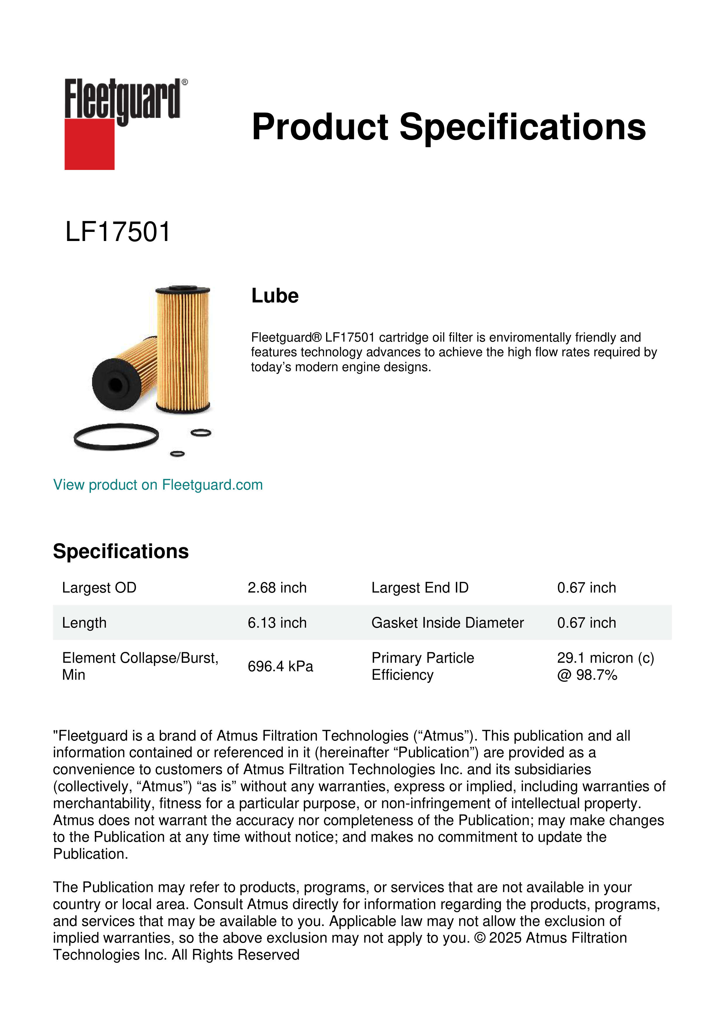Fleetguard® LF17501 cartridge oil filter is enviromentally friendly and features technology advances to achieve the high flow rates required by today’s modern engine designs.