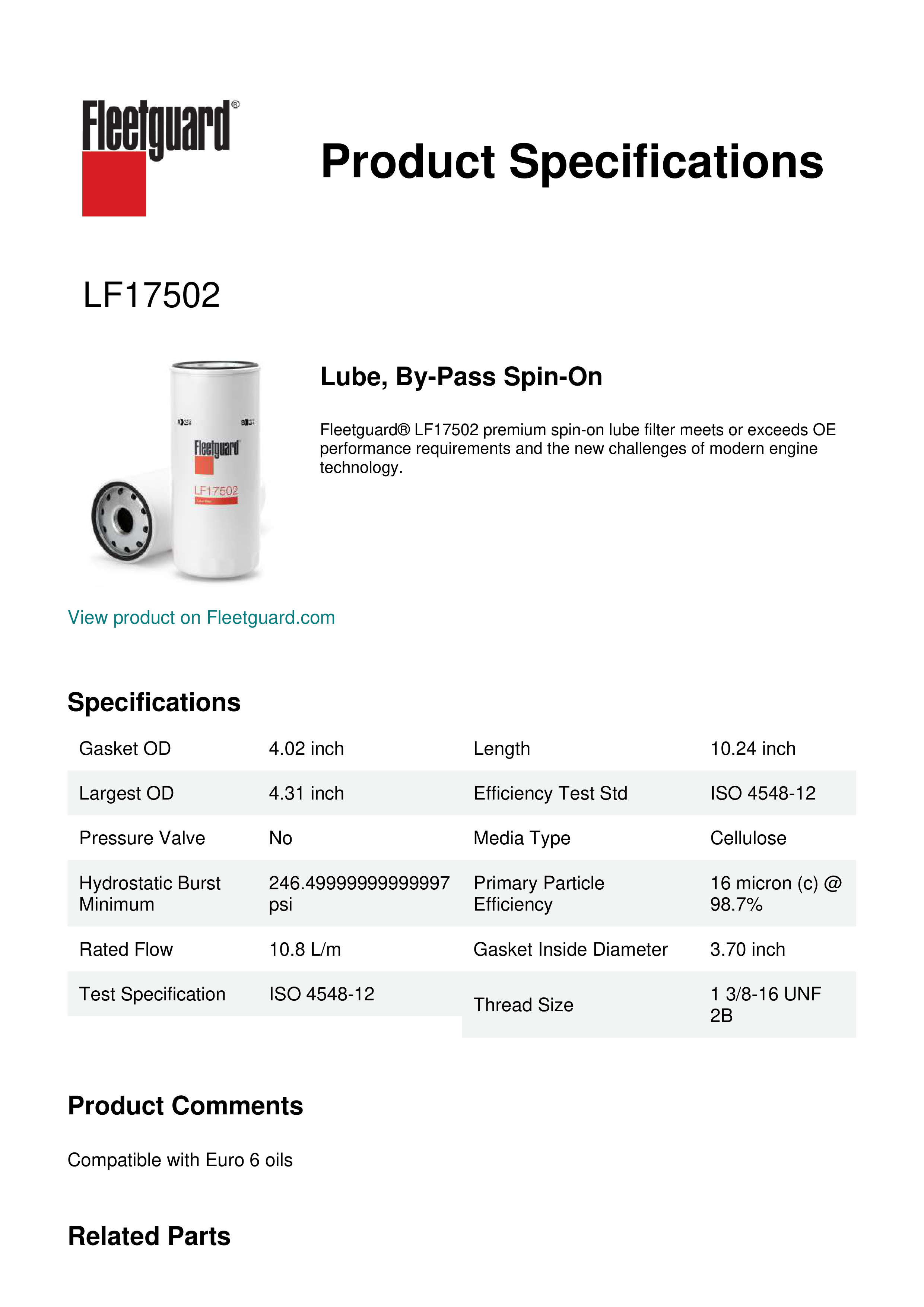 Fleetguard® LF17502 premium spin-on lube filter meets or exceeds OE performance requirements and the new challenges of modern engine technology.Specification