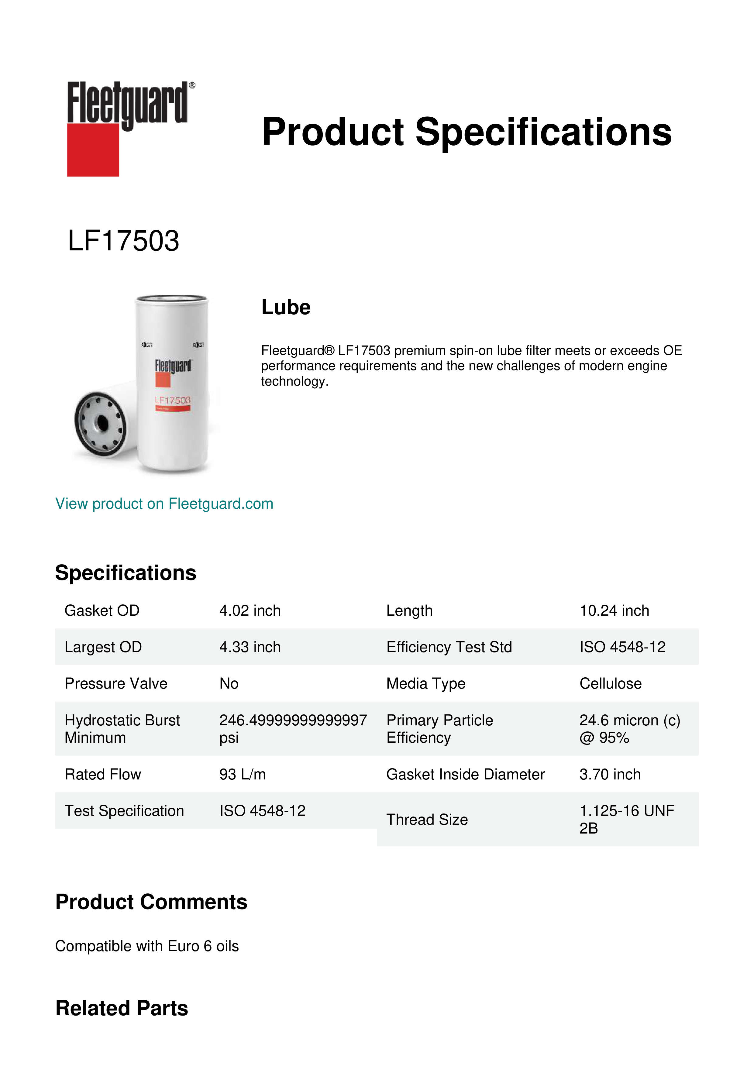 Fleetguard® LF17503 premium spin-on lube filter meets or exceeds OE performance requirements and the new challenges of modern engine technology.Specification