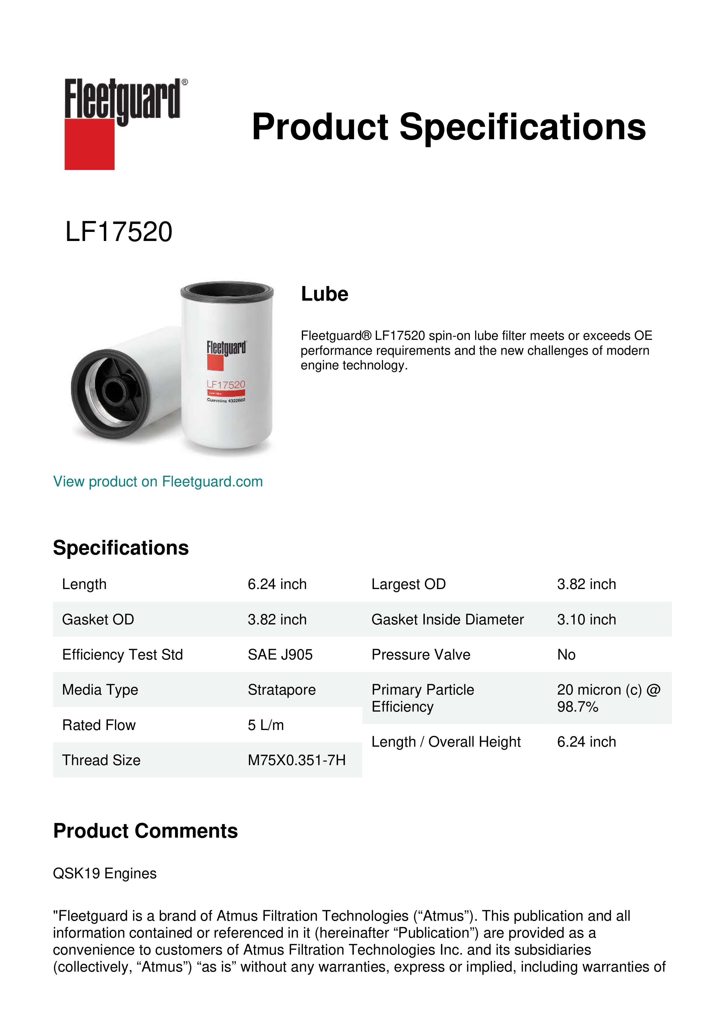 Fleetguard® LF17520 spin-on lube filter meets or exceeds OE performance requirements and the new challenges of modern engine technology.Specification